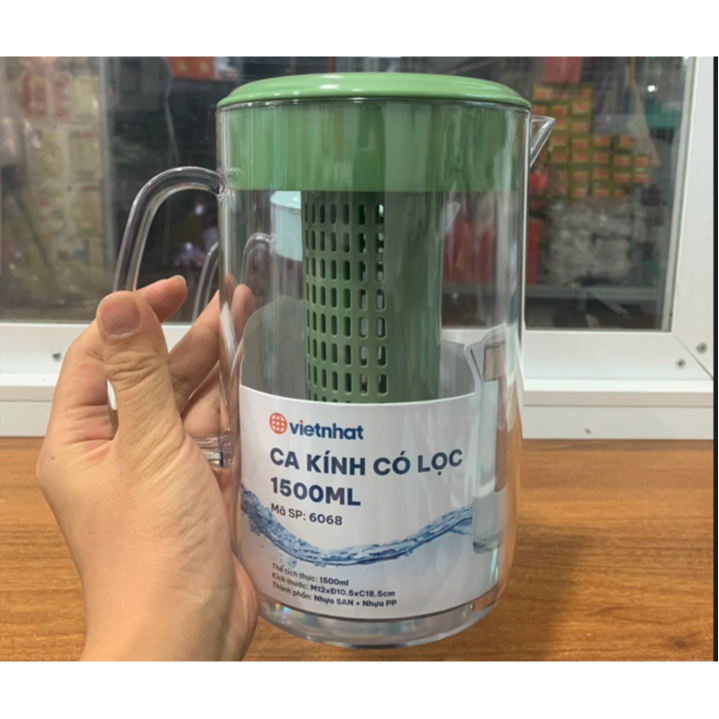 Ca kính có lọc 6068 thiết kế dễ cầm nắm, dung tích lên đến 1500ml thích hợp để đựng nước cho cả ngày. Đặc biệt bên trong ca có lõi lọc giúp pha trà tiện lợi.