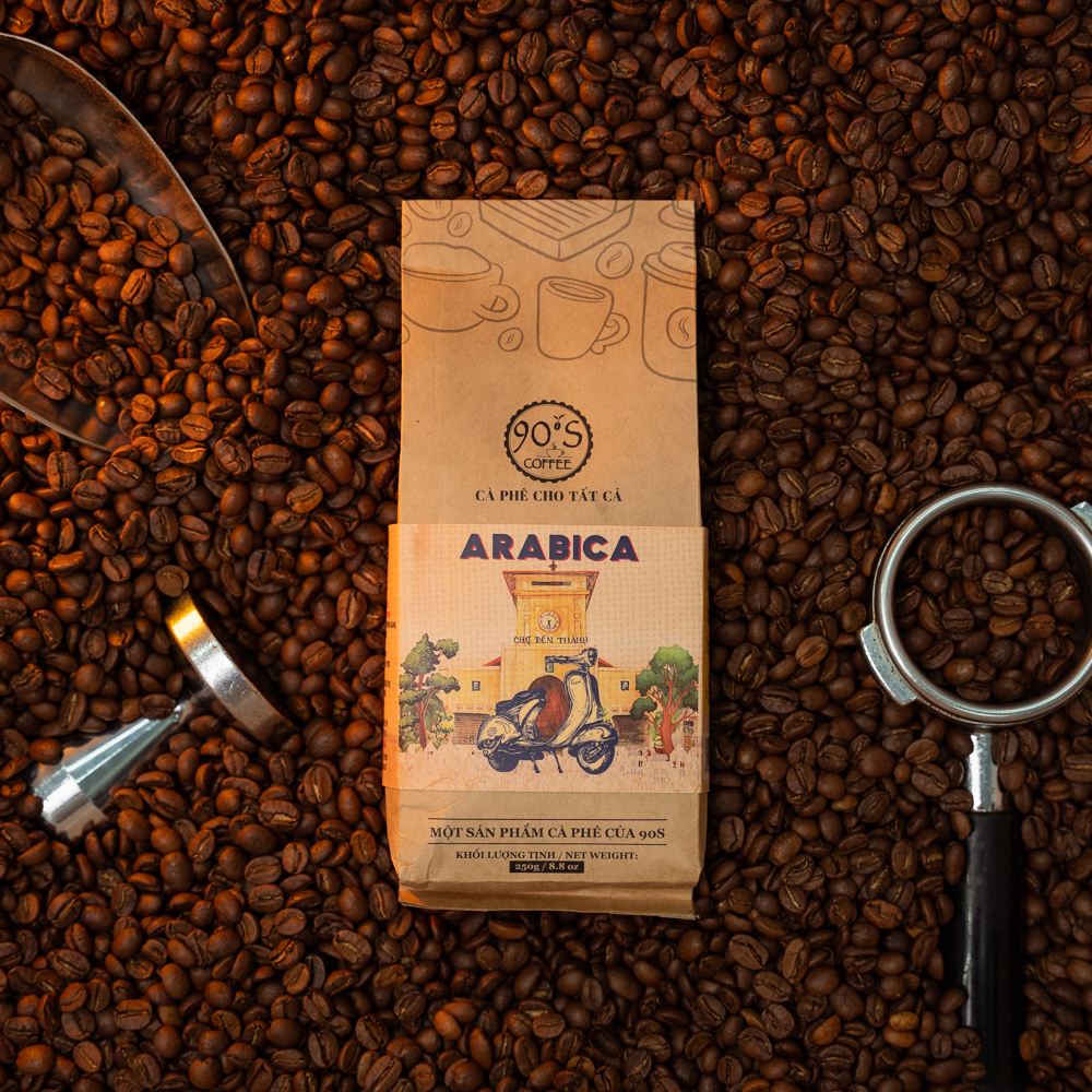 Cà phê hạt Arabica thuộc dòng sản phẩm cà phê rang mộc nguyên chất của 90S Coffee Vietnam. Đây là sản phẩm rất được ưa chuộng trong ngành cà phê bởi đặc tính đa dạng &