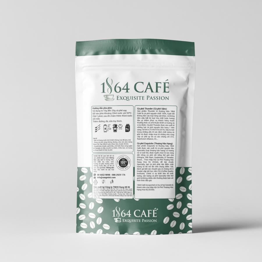 Tất cả sản phẩm Thương hiệu 1864 CAFÉ® đều sử dụng hạt xanh nguyên liệu chất lượng cao Hạng 1, cỡ hạt trên sàng 18/64 in (theo TCVN 4193: 2014), Sản phẩm thành phẩm được bảo quản trong bao bì hợp kim Aluminium tối thiểu phải trên 5 lớp, đạt chuẩn ATVSTP có van 1 chiều chống oxy hóa và Zip lock tiện lợi.