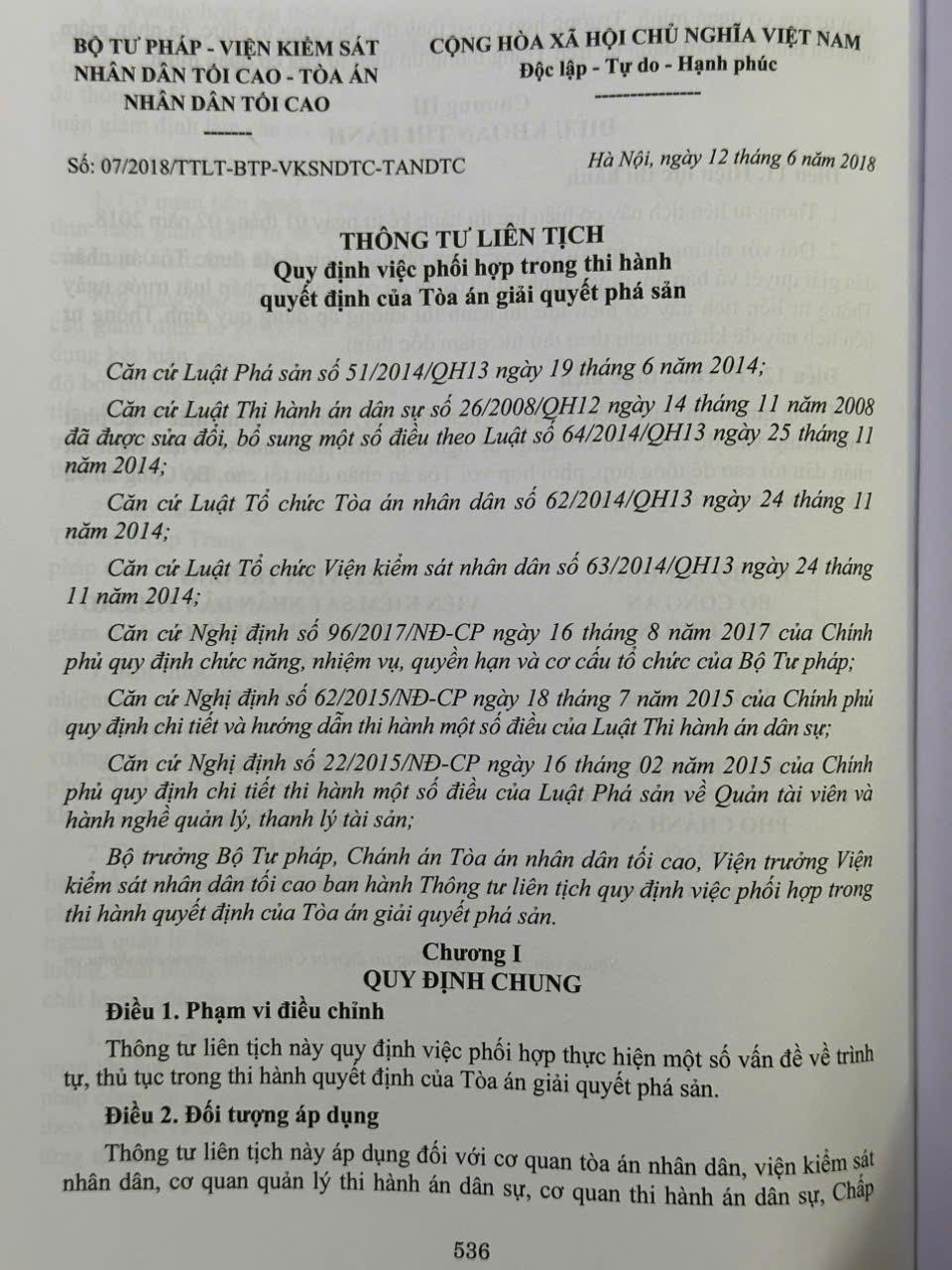 Thời gian qua, Tòa án nhân dân tối cao, Viện kiểm sát nhân dân tối cao, Bộ Công an, Bộ Tư pháp, Bộ Quốc phòng,… đã ban hành nhiều Thông tư liên tịch hướng dẫn về hình sự, tố tụng hình sự, dân sự, TTDS, hành chính, tố tụng hành chính, lao động, kinh tế, thương mại, hôn nhân gia đình.