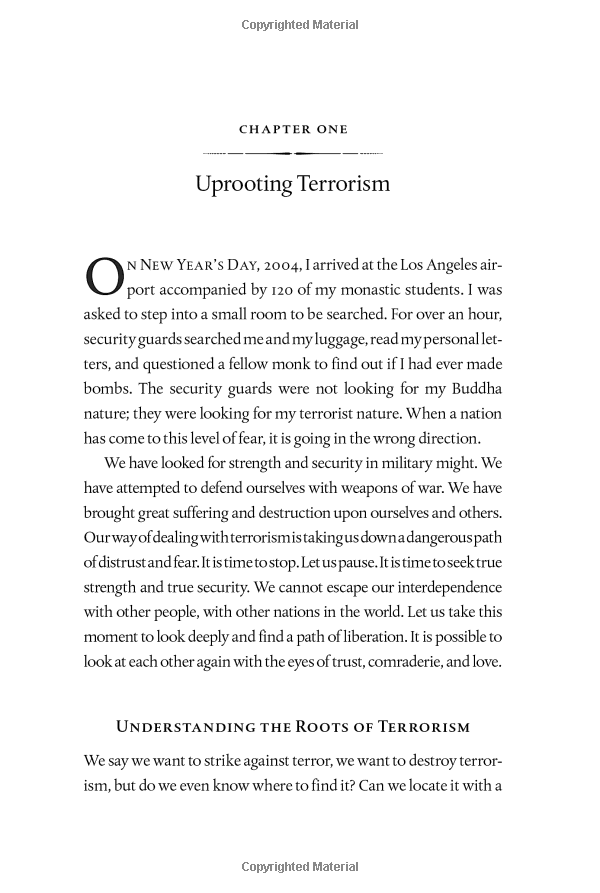 In a time of terrorism and uncertainty, how can any of us feel truly safe? Zen Master Thich Nhat Hanh looks at the real roots of terrorism and fear and offers the way out: a path of compassion and open-heartedness. In this unique book, Thich Nhat Hanh teaches that we will only be safe when we acknowledge our real enemies, not other human beings, but our own ignorance, discrimination, fear, craving, and violence. With clarity and gentleness, Nhat Hanh offers step-by-step instructions for calming the mind and looking deeply into our own misperceptions. His own generosity of spirit and love for all beings models a path out of uncertainty and towards peace. By calming our minds and looking deeply into our hearts, will we have the insight to identify the roots of terrorism. Only with the practice of compassion, deep listening, and mindful communication can terrorism be transformed and uprooted.