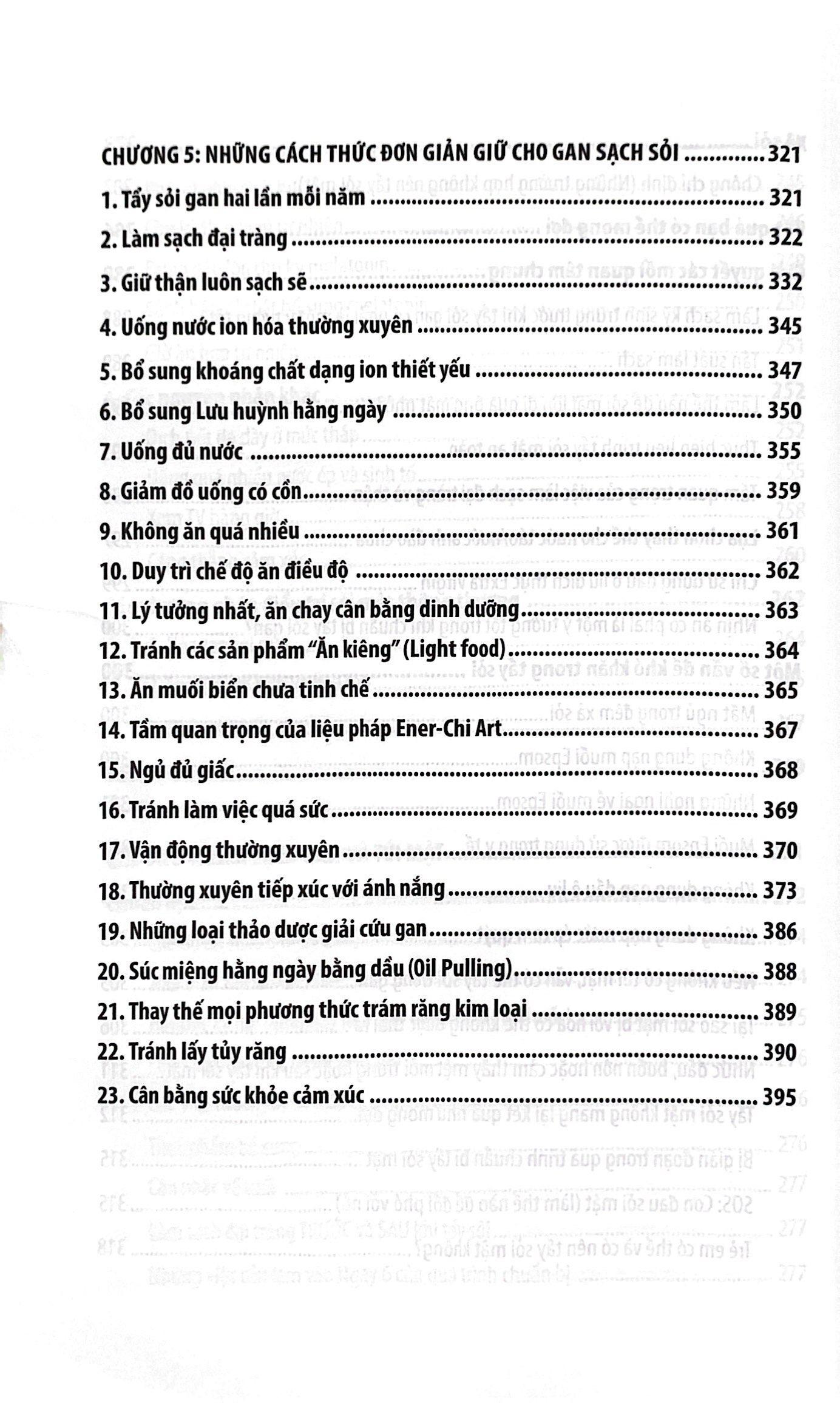 Trong Chương 4, bạn sẽ được hướng dẫn cách tẩy sỏi mật. Về cơ bản, nó bao gồm thời gian chuẩn bị 6 ngày để làm mềm sỏi và sau đó là động tác tẩy sỏi bằng hỗn hợp dầu ô-liu và nước cốt các loại quả họ cam chanh.