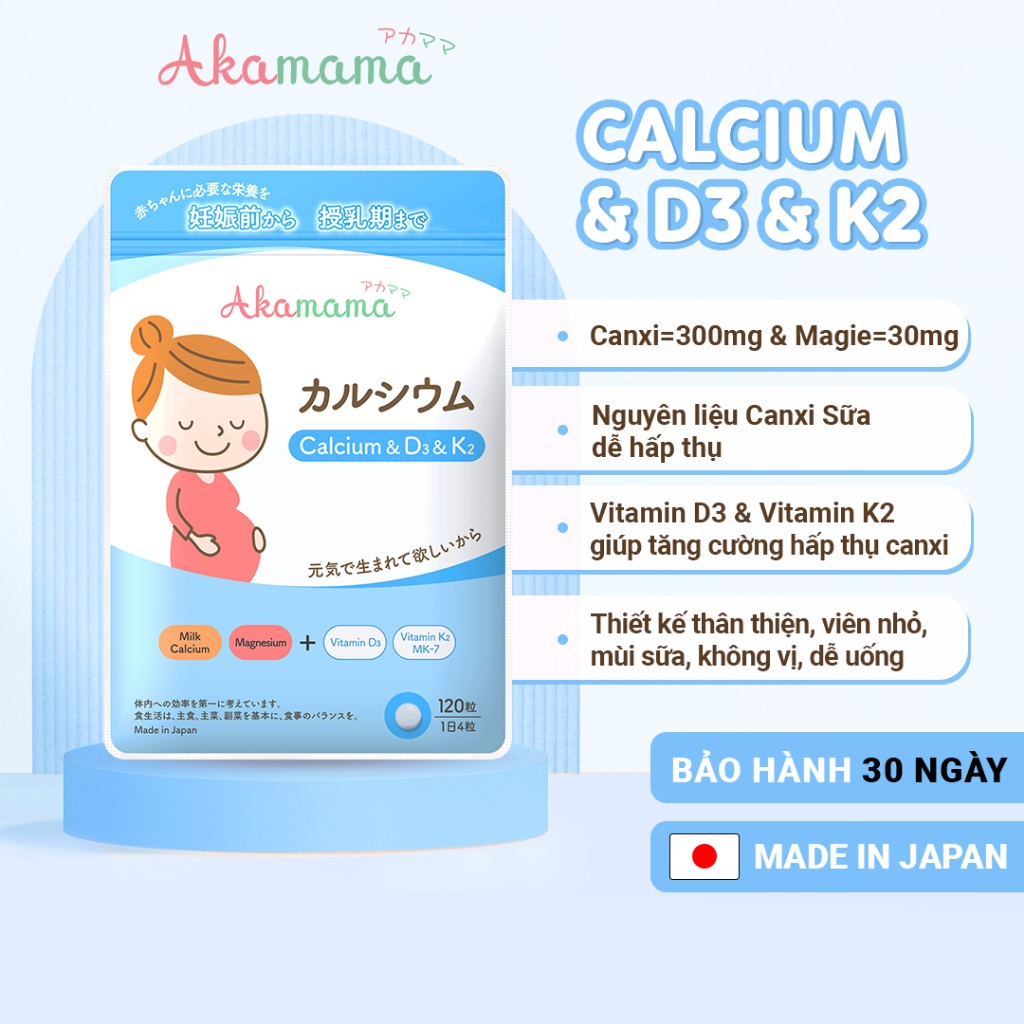 ƯU ĐIỂM CỦA SẢN PHẨM CANXI CHO BÀ BẦU AKAMAMA NHẬT BẢN Ưu Điểm 1: Bổ sung canxi với hàm lượng vừa đủ và an toàn cho thai kỳ Canxi 300mg (Lưu ý: Đây là hàm lượng tổng của 4 viên uống/ngày). Ngoài ra, Akamama được thiết kế thành các viên nhỏ, khách hàng có thể tự tăng giảm lượng bổ sung cần thiết với bản thân.   Ưu Điểm 2: Sử dụng nguyên liệu có khả năng hấp thụ cao Sử dụng Canxi sữa là một loại Canxi hữu cơ có khả năng hấp thụ cao gấp 3-4 lần so với Canxi vô cơ, hơn nữa dịu nhẹ đối với dạ dày, hạn chế được tình trạng nóng trong, táo bón.   Ưu Điểm 3: Kết hợp thêm Vitamin D3, Vitamin K2, tăng cường khả năng hấp thụ canxi Vitamin D3 giúp tăng cường hấp thụ Canxi từ ruột vào máu.  Vitamin K2 giúp tăng cường hấp thụ Canxi từ máu vào xương.   Ưu Điểm 4: Thiết kế thân thiện với cả bà bầu ốm nghén Viên uống nhỏ, đường kính chỉ 9mm, dễ dàng uống mà không sợ bị nghẹn. Viên uống mùi sữa nhẹ, không vị, dễ uống với cả các bà bầu nhạy cảm trong thai kỳ.   CÔNG DỤNG SẢN PHẨM: Bổ sung Canxi, Magie cho cơ thể bé và mẹ. Cung cấp thêm Vitamin D3, Vitamin K2, Magie là chất dinh dưỡng cần thiết giúp tối đa hoá khả năng hấp thụ canxi. Hạn chế tình trạng tê bì chân tay, đau lưng, đau khớp thường gặp của các bà bầu. Giảm nguy cơ tiền sản giật.   BẢNG THÀNH PHẦN VÀ HÀM LƯỢNG DINH DƯỠNG (CÓ TRONG 4 VIÊN) Canxi: 300mg Magie: 30mg Vitamin D3: 7.5ug (300IU) Vitamin K2 (MK-7): 30ug   ĐỐI TƯỢNG SỬ DỤNG