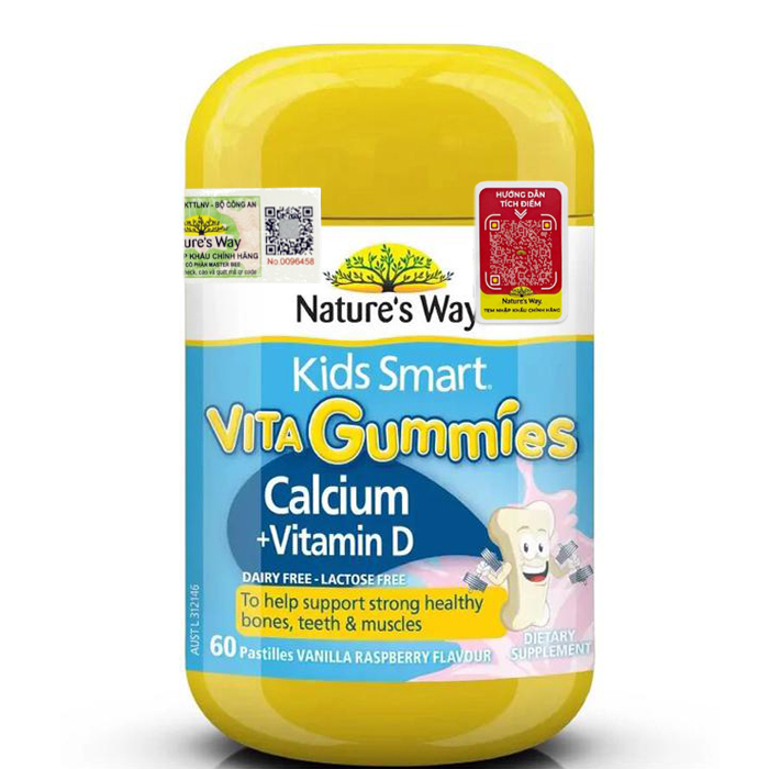 Mua tại TiktokCanxi + Vitamin D cho trẻ 2-11 tuổi Kids Smart Vita Gummies Calcium + Vitamin D Nature's Way Úc giúp hỗ trợ xương, răng và cơ bắp khỏe mạnh, cao lớn 1.Giới thiệu canxi + Vitamin D cho trẻ 2-11 tuổi Kids Smart Vita Gummies Calcium + Vitamin D Nature's Way Úc - Phân Loại: Canxi + Vitamin D cho trẻ 2-11 tuổi - Thương hiệu: Nature's Way - Xuất xứ: Úc - Đóng gói: 60 viên dạng kẹo Thương hiệu số 1 tại Úc về dòng sản phẩm dành cho trẻ em. Các sản phẩm của Nature’s Way hiện đã có mặt tại Việt Nam và được đông đảo các mẹ thông thái lựa chọn cho con. Kẹo dẻo hương vị vani mềm và thơm ngon giúp hỗ trợ bổ sung canxi và Vitamin D cho bé. Không chứa các CHẤT GÂY DỊ ỨNG, an toàn tuyệt đối cho trẻ 2.Công dụng canxi + Vitamin D cho trẻ 2-11 tuổi Kids Smart Vita Gummies Calcium + Vitamin D Nature's Way Úc - Bổ sung Canxi và vitamin D với tỉ lệ tối ưu giúp hấp thụ tối đa lượng canxi đưa vào cơ thể, chống còi xương và các bệnh lý thiếu canxi. - Hỗ trợ mọc răng sớm giúp trẻ ăn nhai dễ dàng hơn, đồng thời giúp răng chắc khỏe hơn. - Hỗ trợ hệ xương vững chắc cho trẻ, giúp tăng chiều cao vượt trội. - Hỗ trợ sức khỏe hệ thần kinh. - Giúp tăng cường hệ tiêu hóa, kích thích vị giác giúp bé ăn ngon miệng, hấp thụ được dưỡng chất tốt hơn và cải thiện cân nặng, chiều cao. - Tăng cường hệ miễn dịch và sức đề kháng của cơ thể. Hạn chế ốm vặt - Trẻ ngủ ngon, giảm quấy khóc đêm Bao bì mẫu mã thay đổi theo từng đợt nhập hàng 3.Thành phần canxi + Vitamin D cho trẻ 2-11 tuổi Kids Smart Vita Gummies Calcium + Vitamin D Nature's Way Úc Thành phần hoạt chất trong mỗi viên kẹo canxi cho bé gồm: - Canxi phosphate: 233.34 mg (tương đương canxi 87.5mg) - Colecalciferol (vitamin D3 100 IU): 2.5 microgram - Calcium: 100mg - Vitamin D3: 200IU 4.Đối tượng canxi + Vitamin D cho trẻ 2-11 tuổi Kids Smart Vita Gummies Calcium + Vitamin D Nature's Way Úc - Dành cho trẻ em trên 2 tuổi. - Trẻ em thiếu hụt vitamin và khoáng chất - Trẻ em có sức đề kháng kém, tiêu hóa kém, lười ăn, chậm hấp thu. - Trẻ nhỏ thiếu canxi, còi xương, chậm mọc răng, răng mọc không đều. - Đổ mồ hôi trộm, rụng tóc hình vành khăn, thóp liền muộn. 5.Cách sử dụng canxi + Vitamin D cho trẻ 2-11 tuổi Kids Smart Vita Gummies Calcium + Vitamin D Nature's Way Úc - Trẻ em 2-8 tuổi: 2viên /ngày. - Trẻ em 9-11 tuổi: 3viên /ngày. Hoặc theo lời khuyên của chuyên gia sức khỏe của bạn. 6.Cách bảo quản canxi + Vitamin D cho trẻ 2-11 tuổi Kids Smart Vita Gummies Calcium + Vitamin D Nature's Way Úc - Bảo quản nhiệt độ phòng dưới 25 độ C, nơi khôn ráo, tránh ánh nắng trực tiếp, tránh va đập mạnh. - Tránh xa tầm tay trẻ em 7.Một số câu hỏi thường gặp canxi + Vitamin D cho trẻ 2-11 tuổi Kids Smart Vita Gummies Calcium + Vitamin D Nature's Way Úc - Chúng tôi luôn quan tâm hàng đầu đến sức khỏe của bạn. - Sản phẩm này không phải là th uốc và không có tác dụng thay thế thuốc chữa bệnh - Cam kết hàng nhập khẩu chính hãng 100'/. - Các sản phẩm của shop đều được kiểm tra (giấy tờ xuất xứ và giấy Công bố sản phẩm do Cục An Toàn Thực Phẩm cấp) khi trình duyệt đăng bán sản phẩm. - Ngoài ra shop xuất có xuất hóa đơn VAT khi khách yêu cầu. - Để liên hệ vui lòng nhắn tin vào hộp thư “Chat”
