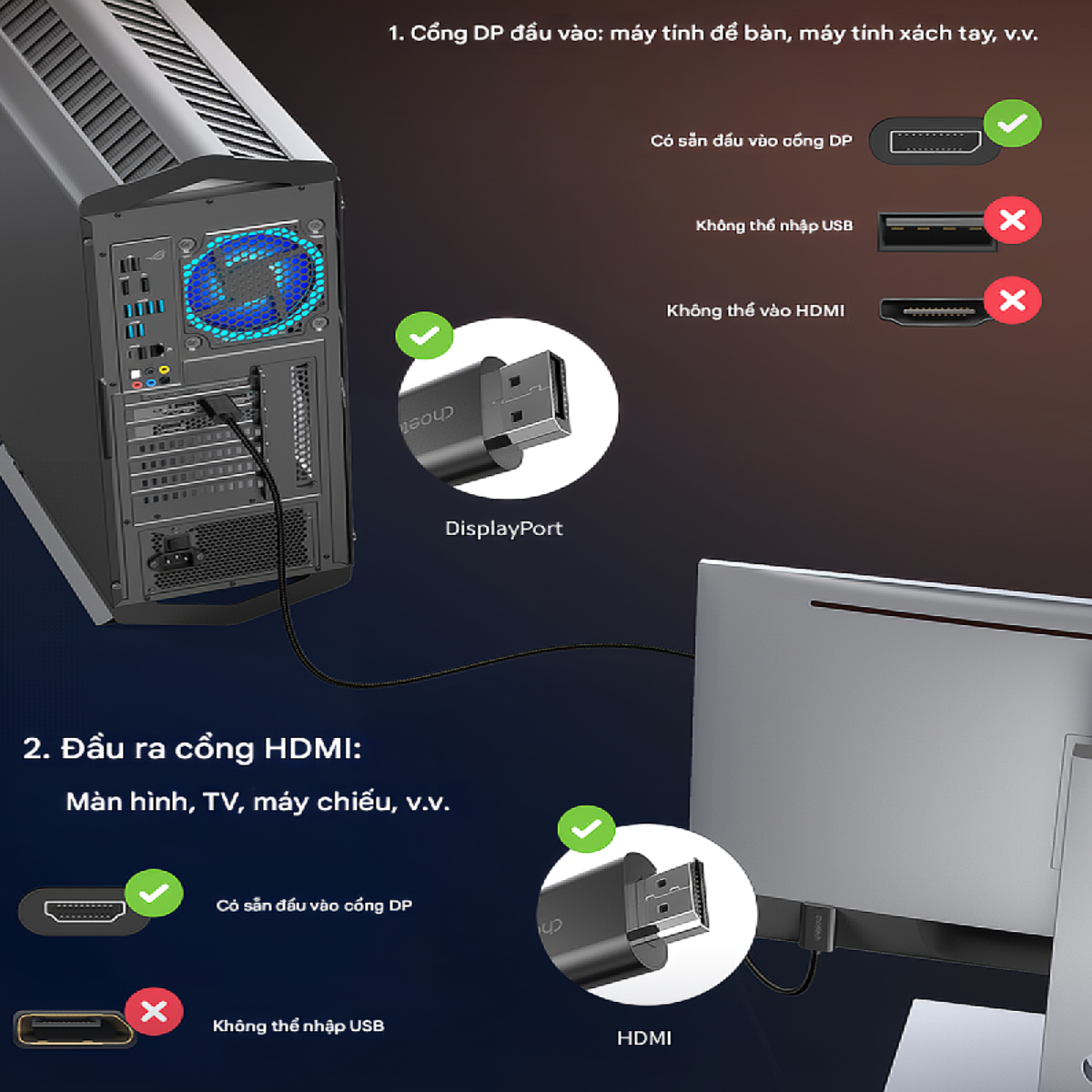 - Tương thích: Laptop, PC, card đồ họa có cổng DP