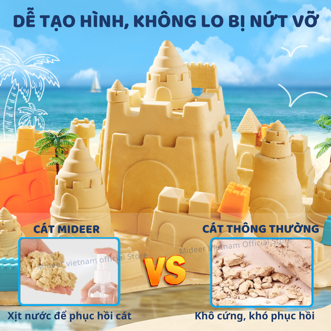- KẾT CẤU MỊN VÀ KHÔNG DÍNH: Bé chơi sạch sẽ, mẹ không lo ngại. Ngoài ra, cát Mideer chỉ cần một ít nước để làm mềm trở lại, còn các loại cát thông thường dễ khô cứng và khó phục hồi như ban đầu.