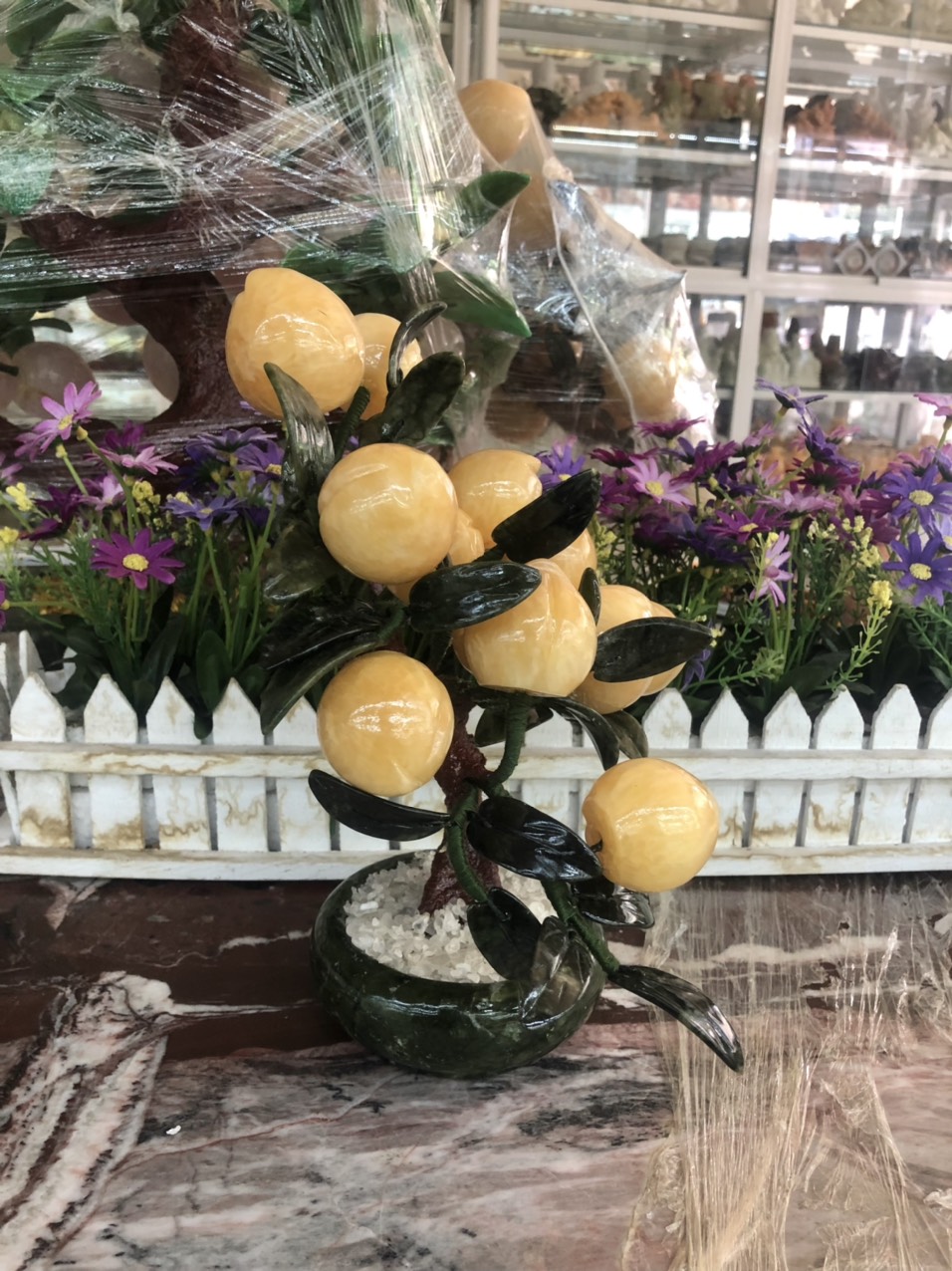 Tượng Cây Đào mới vàng 13 quả canxit vàng tự nhiên cao 40cm x ngang 34cm x sâu 20cm tài lộc hợp ACE mệnh kim thổ Trưng bày phòng khách rất là sang Cây đào