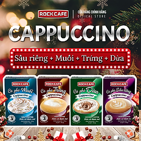 COMBO 4 HỘP CAPPUCCINO TRỨNG + MUỐI + SẦU RIÊNG + DỪA - ROCKCAFE - CAPPUCCINO TRỨNG (5 gói x 30 gram) là sản phẩm cà phê hòa tan đặc biệt mang đến trải nghiệm