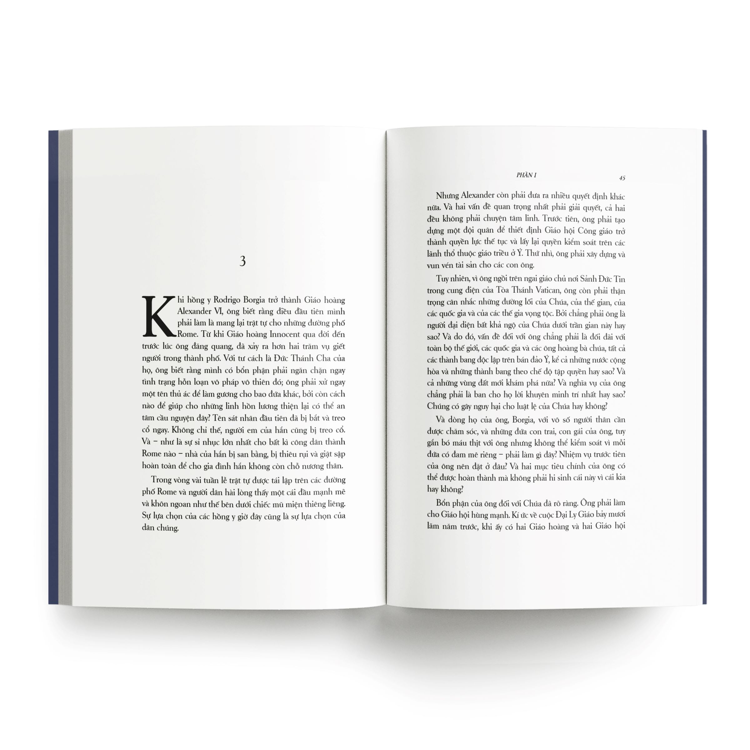 Cha con Giáo hoàng là một thiên sử thi xuất sắc, pha trộn màu sắc lãng mạn với chất cuồng điên của lòng tham quyền lực, những mưu ma chước quỷ, tội lỗi và trừng phạt… vượt xa khỏi trí tưởng tượng của người thường. Cuốn sách mang người đọc du hành đến một không gian, thời gian hoàn toàn khác, nơi Giáo hội nắm quyền thống trị tối cao, nơi lửa tham vọng ngùn ngụt cháy dưới tấm áo choàng đỏ rực. Đây là câu chuyện về mối quan hệ cha con kì lạ: gắn bó với nhau bởi huyết thống, lòng tận tụy và những ý đồ đen tối; về một gia đình khét tiếng mà công trạng và tội lỗi còn mãi lưu truyền hậu thế: gia đình Borgia.