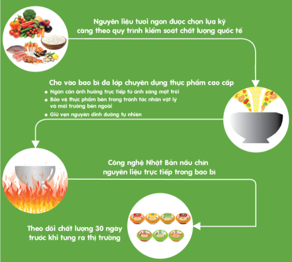 - Không chất bảo quản nhờ bao bì đa lớp chuyên dụng kết hợp Công nghệ Nhật Bản nấu chín trực tiếp nguyên liệu trong bao bì.
