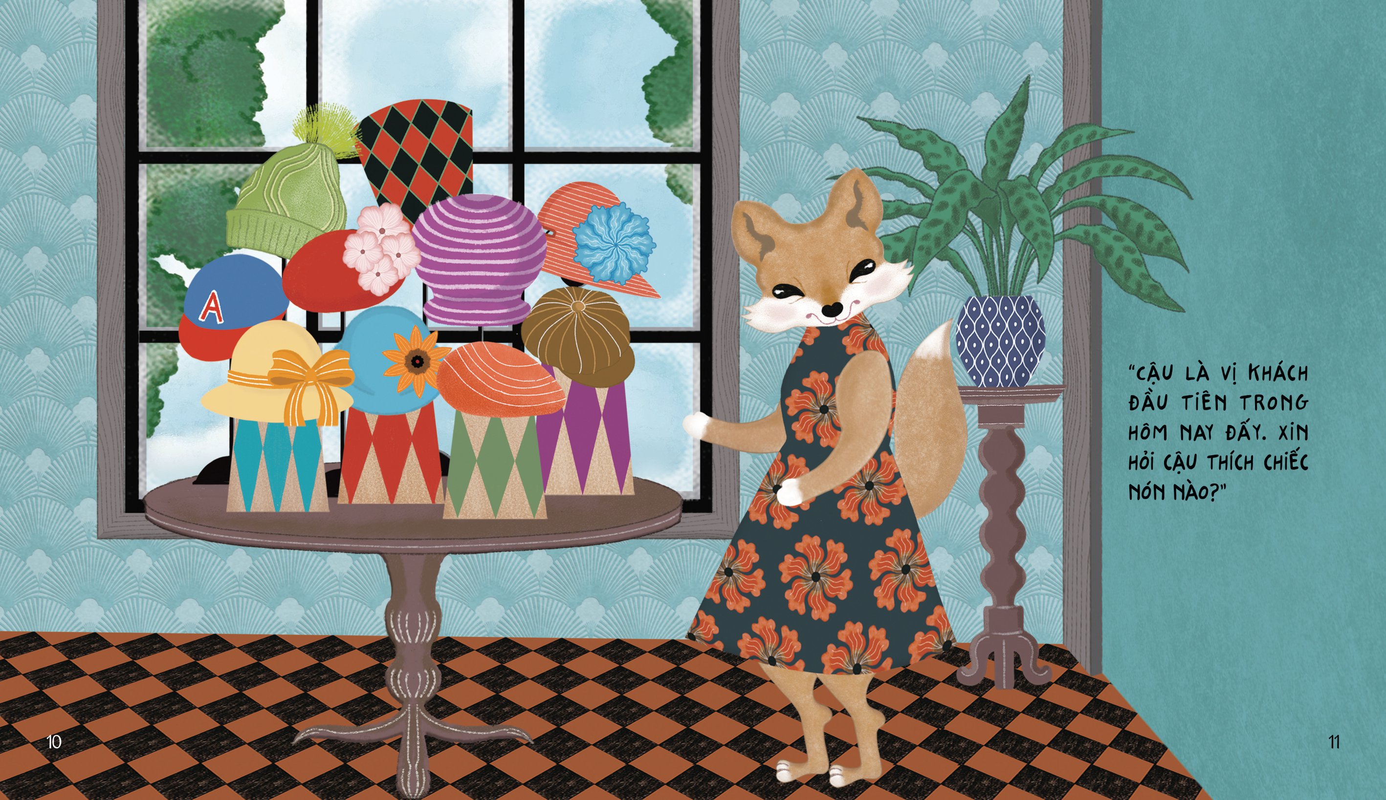 Mỗi ngày Bà Cáo đều say mê làm nón. Cửa tiệm của Bà Cáo có đủ kiểu nón đẹp nhất trên đời: Nón bê rê, nón chóp cao, nón lưỡi trai… Mỗi vị khách lại yêu thích một loại nón riêng. Mời bạn đến thăm cửa tiệm tuyệt vời của Bà Cáo nhé!