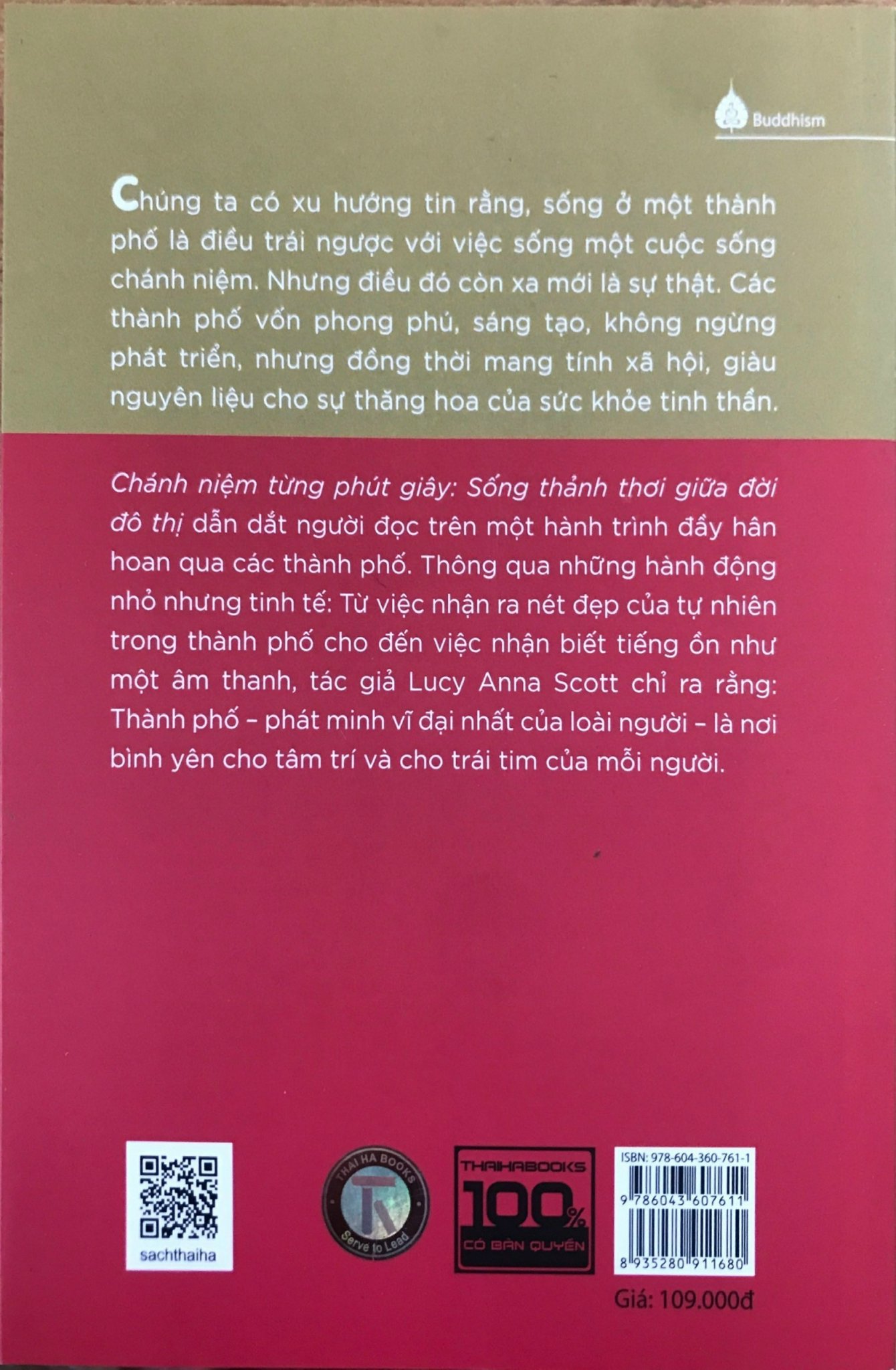 Cuộc sống thành thị vốn được ngầm định là quá huyên náo để đem đến sự yên bình, quá áp lực để cho phép bản thân được kết nối với thực tại – trong từng khoảnh khắc, với những con người khác, và cả với chính bản thân. cuốn sách này sẽ cho bạn thấy giá trị của một thành phố – một môi trường cho phép bạn được nhìn, nghe và cảm nhận nhiều hơn. Nhiều cư dân thành phố có thể lý tưởng hóa việc đánh đổi những căn hộ nhỏ-cỡ-tem-thư của họ để lấy một căn nhà yên tĩnh bên bờ biển. Việc làm để gần gũi thiên nhiên hơn như vậy – mặc dù cũng quan trọng cho tâm hồn – chưa chắc sẽ đem lại sự kết nối như khi ta ở cùng với những con người khác.  Đây là cuốn sách nằm trong bộ “Chánh niệm từng phút giây”. Cuốn sách gợi mở những suy nghĩ mới về cuộc sống thành thị – như một cách tiếp cận có “chánh niệm” hơn với cuộc sống. Cuộc sống chánh niệm đến từ việc hiểu thành phố sâu sắc hơn – khám phá những tầng lớp của nó, đào sâu bên dưới sự ồn ào, sương mù, và các đám đông. Mục lục: Lời giới thiệu: Thông điệp từ một người yêu thành phố  Một phần của thành phố chánh niệm Hít thở cùng những cái cây  Một chân trời mới  Ngắm chim bay  Nghệ thuật ngắm nhìn  Học cách lạc quan  Trân trọng sự hỗn loạn  Niềm vui của cuộc sống nhỏ bé Trân trọng sự tháo vát Kết nối với những giác quan Miệt mài trong sự thay đổi Tìm cái đẹp trong dạng thức Khám phá âm nhạc Qua con mắt của những người khác Tạo ra những ký ức tâm hồn Ngôi nhà cho những người hướng nội Nơi ẩn náu trong thành phố Đi dạo ban đêm Sắc màu của mùa đông Hãy để mưa xoa dịu bạn Tạo ra một ốc đảo hoang dã Tin thành phố Xây dựng thành phố chung Ở bên những người khác Yêu giống loài đô thị Tác giả: Lucy Anna Scott là một nhà văn có niềm yêu thích nghệ thuật với những câu chuyện khám phá cách thực vật, cây cối và phong cảnh giúp chúng ta hiểu rõ hơn về bản thân. Cô đồng sáng lập Lost in London , một tạp chí indie chuyên khám phá những cảnh quan hoang dã của thành phố. Những cuốn sách trước đây của cô bao gồm Lạc lối ở London: những cuộc phiêu lưu ngoài trời hoang dã của thành phố và Khu vườn tí hon của tôi  Trích đoạn nội dung: Nhiều thành phố sở hữu vô số nguyên liệu thô để tạo ra những không gian lành mạnh hơn, hạnh phúc hơn. Thành phố có thể là ngôi nhà cho một số loài sinh vật hiếm, khó có thể tìm thấy ở bất cứ nơi nào khác; như ở thành phố của tôi có các loài dơi, bướm, nhện và cây. Tôi có thể vươn mình thức dậy cùng mặt trời để lắng nghe dàn hợp xướng của buổi bình minh, và tìm thấy những dòng suối trong vắt đến nỗi nước của chúng lấp lánh. Trong thành phố, tôi có thể sống một cuộc sống phù hợp hơn là ở nông thôn; sự đông đúc của thành phố có nghĩa là tôi không cần đến một cái ô tô để đi đến mọi ngóc ngách, và các thị dân cũng không quá xa lạ với việc tái chế. Các nhà sinh thái học đã phát hiện ra rằng, sự tập trung dân số và hệ thống giao thông công cộng làm giảm thiểu sự xâm lấn của con người lên môi trường tự nhiên, và các căn hộ trong đô thị tiết kiệm năng lượng hơn là những căn nhà đơn lẻ ở ngoại thành. Điều đó có nghĩa, mọi thị dân đều có thể là những người tìm ra giải pháp cho một hành tinh bền vững và một tương lai cho loài người. Cảm nhận sự kỳ diệu của vạn vật trong mỗi hoạt động tốt cho sức khỏe và niềm hạnh phúc trong ta – điều này đặc biệt đúng trong môi trường đô thị, khi chúng ta thường hăng hái, cố gắng hoàn thiện cái danh sách những-việc-cần-làm theo cách vội vã nhất. Chúng ta không chỉ vận dụng trí óc, hiểu biết để kết thúc mọi việc cần làm, mà là sử dụng đôi bàn tay để cảm nhận và kết nối với chính thành phố – hình dạng, cấu trúc của thành phố thế nào; nó ấm áp hay lạnh lẽo ra sao; nó mềm mại đến đâu. Màu sắc là phương thuốc của tôi. Vào những ngày Chủ nhật ảm đạm, tôi thường làm một chuyến đi quanh các phòng trưng bày nghệ thuật của thành phố để tìm kiếm một chất kích thích cho tâm hồn. Các nhà tâm lý và các nhà trị liệu nghệ thuật nhận thức rõ ràng màu sắc có thể ảnh hưởng đến trạng thái thể chất và tinh thần của chúng ta như thế nào – màu đỏ có thể gửi adrenaline tràn vào mạch máu; màu xanh da trời, xanh lá cây và tím có thể đưa đến cảm giác bình tĩnh; và màu da cam có thể mang lại cảm giác ấm áp. Các phòng trưng bày là những nguồn tài nguyên phong phú về trị liệu màu sắc và chúng có mặt ở hầu hết các thành phố. Không chỉ bởi một chuyến viếng thăm một phòng trưng bày nghệ thuật thì ít tốn kém hơn một cuộc trốn chạy đến nơi đầy nắng, mà các phòng trưng bày thì luôn luôn thay đổi, với vòng quay luân chuyển của các nghệ sĩ và các bức tranh – do vậy một cái gì đó tư