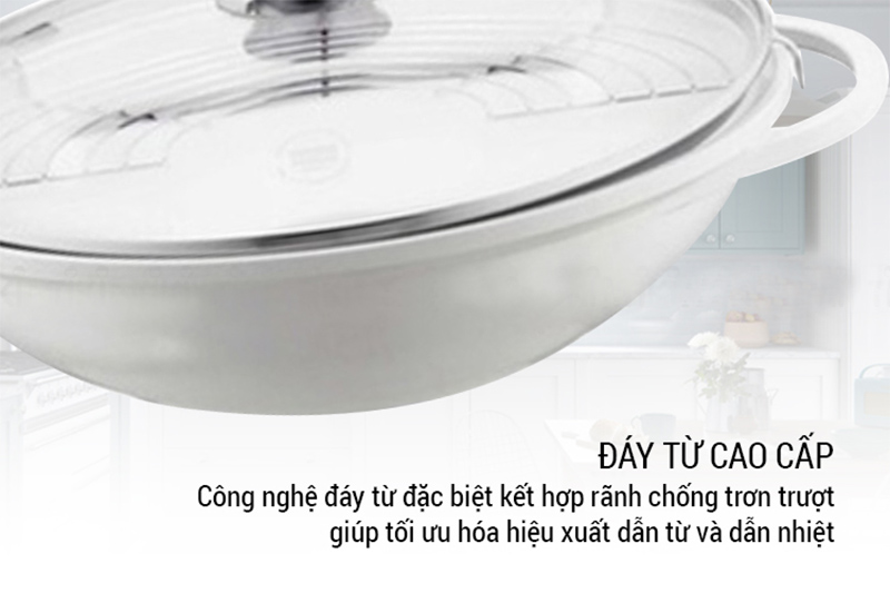 Chất liệu: Nhôm đúc đã được tôi rèn để gia tăng độ bền và tối ưu hóa trọng lượng - Đáy làm bằng thép từ tính dày 4,5mm thiết kế rãnh cho phép dẫn nhiệt