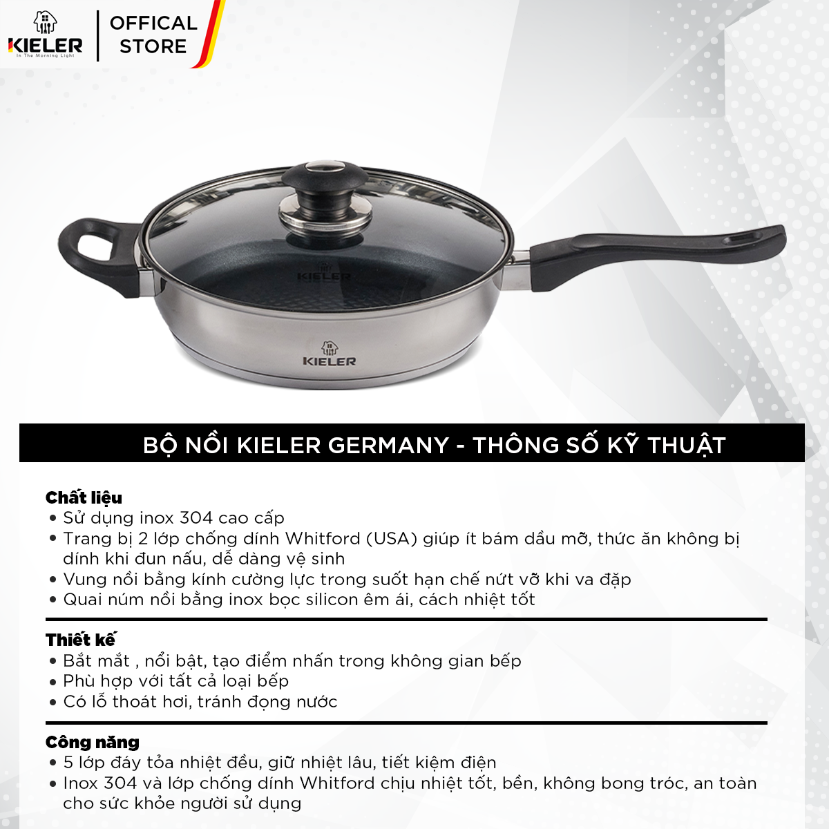 Thiết kế sang trọng và đẹp mắt Chất liệu inox 304 cao cấp Vung kính, tay cầm cách nhiệt Thiết kế sâu lòng, xào nấu tiện lợi