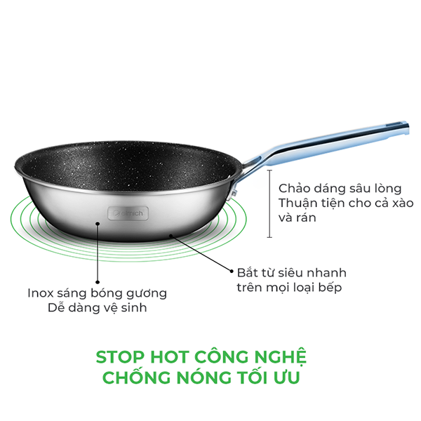 - Chảo Inox Cao Cấp 2 Lớp Đáy Liền Elmich Tri-Max thiết kế 2 lớp cả thân đáy liền bắt nhiệt nhanh và tỏa nhiệt đều từ thành và đáy. Thực phẩm chín đều được