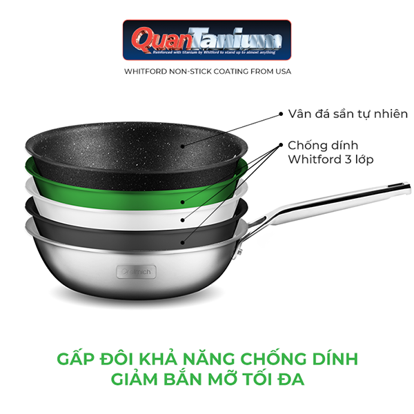 Lòng chảo Trimax CZ được phủ vân đá sần tự nhiên và chống dính 3 lớp Whitford Quantanium (Hoa Kỳ) cho độ bền bỉ tối ưu. Đây là loại chống dính tuyệt đối an toàn cho sức khỏe, không chứa các chất có hại như PFOA, APEO. Chống dính Whitford đạt tiêu chuẩn FDA của Mỹ và được sử dụng trên toàn thế giới.