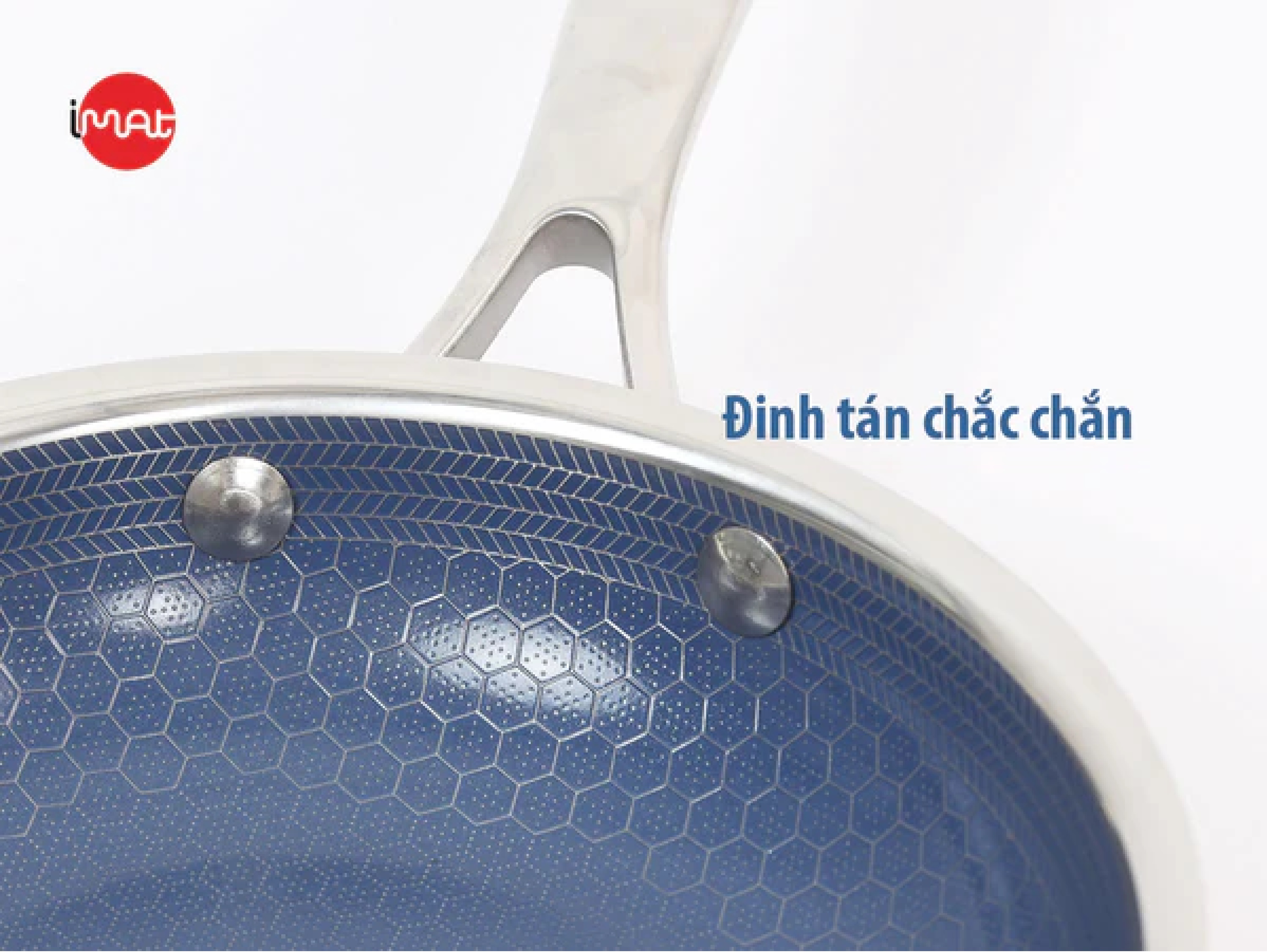 Chảo đa năng iMat Hybrid có tay cầm bằng inox đúc rỗng với công nghệ đặc biệt ghép nối với thành chảo nên không nóng, nhẵn và sáng bóng nên dễ dàng rửa sạch và luôn đẹp, sang trọng. Riêng với chảo xào 32cm có hai quai cầm hai bên.