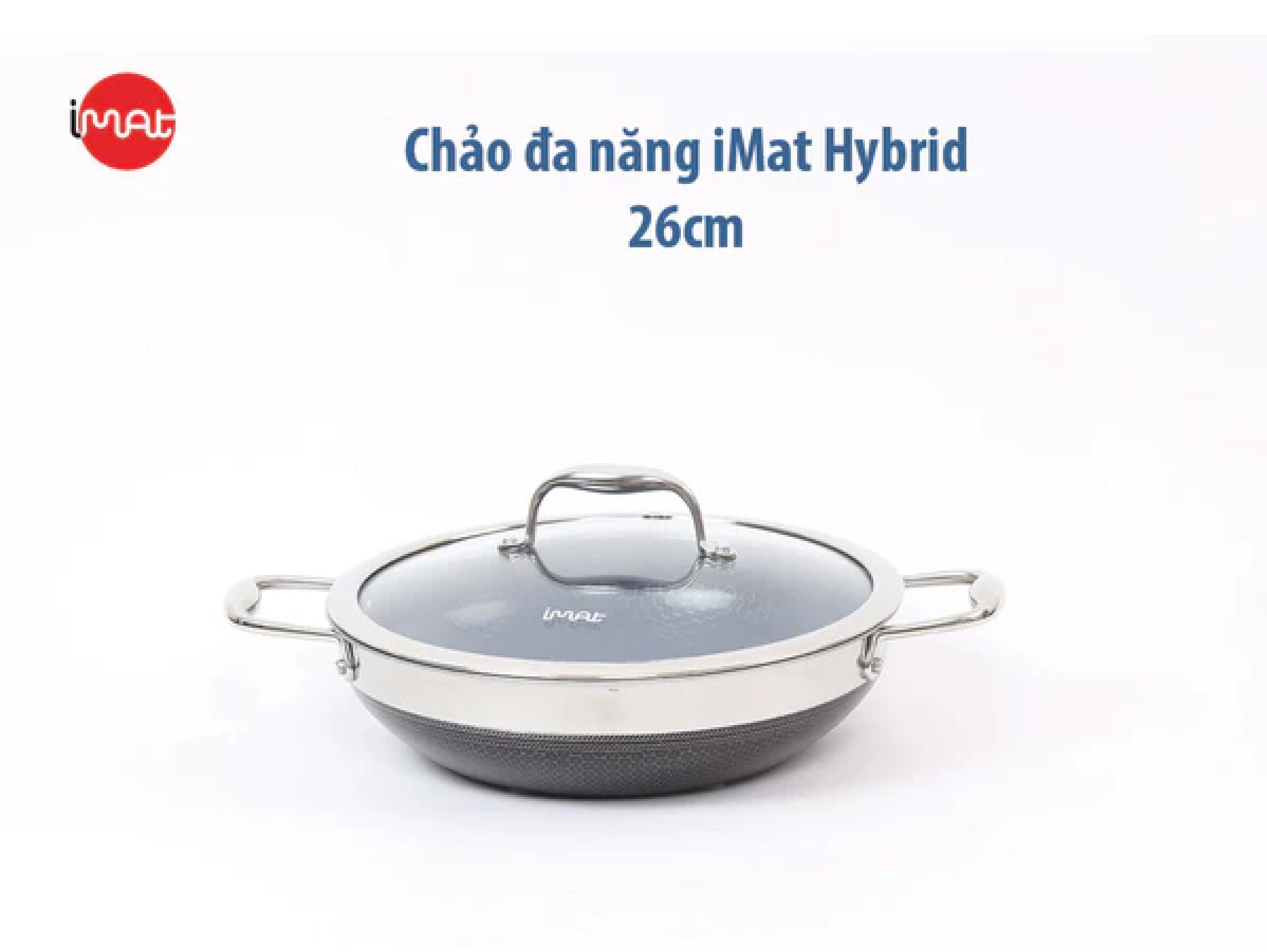 CAM KẾT PHÂN PHỐI SẢN PHẨM CHÍNH HÃNG BẢO HÀNH ĐỔI MỚI CHO LỚP SẢN CHỐNG DÍNH BONG TRÓC TRONG 12 THÁNG. Chảo đa năng iMat Hybrid là sự kết hợp giữa chất liệu inox