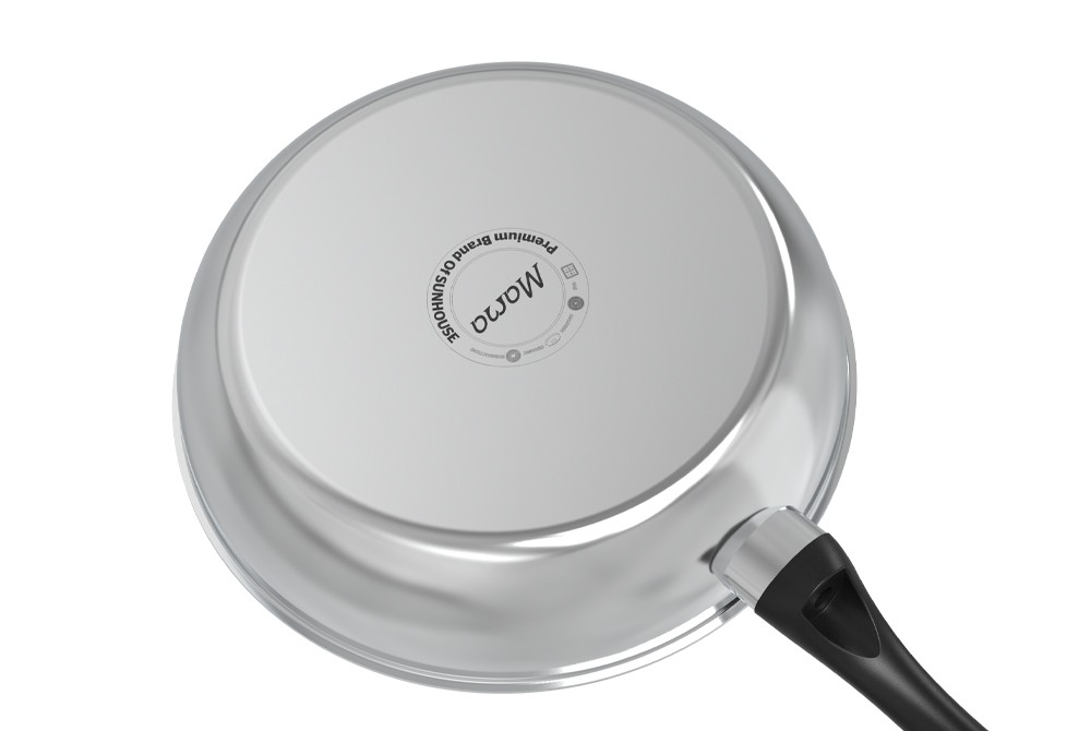 Đáy inox 430 còn giúp bạn sử dụng chảo Sunhouse Mama DE22M hiệu quả trên mọi loại bếp như bếp từ, bếp hồng ngoại, bếp gas… Cấu tạo đáy liền thân giúp chống cong vênh hay phồng đáy, chống bong đáy.
