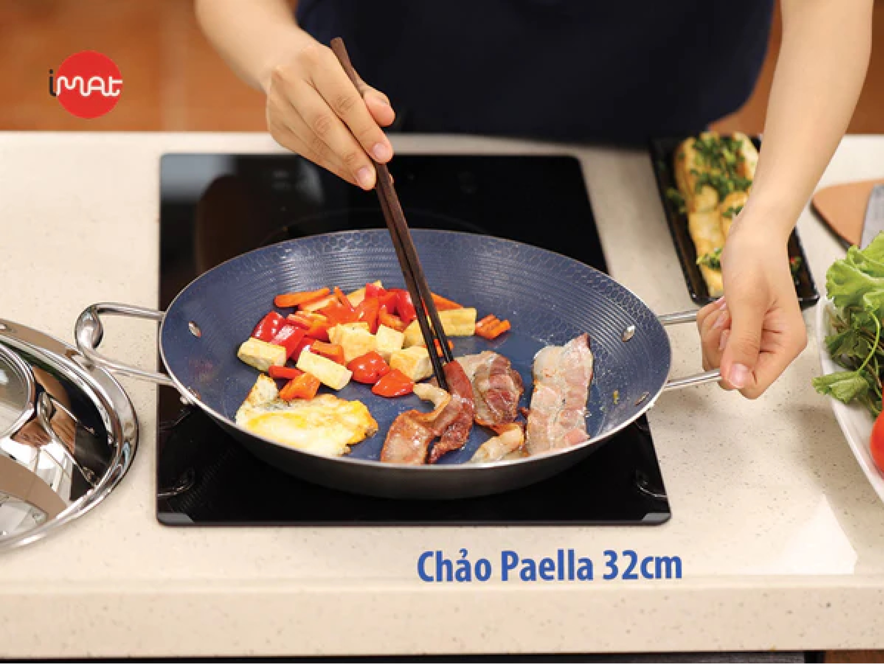 Chảo đa năng iMat Hybrid 32cm là chảo cỡ đại, hai tay cầm. Thích hợp với chiên xào các món lớn, nhiều người ăn. Lòng chảo rộng với công nghệ Blackcube giúp cho các món chiên