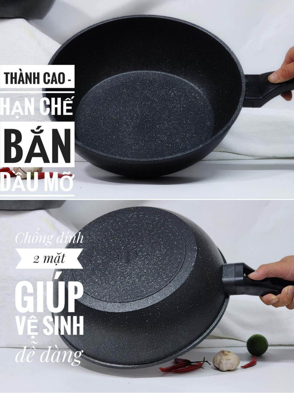 - Chất liệu nhôm nguyên khối cao cấp, phủ đá toàn thân bền bỉ , chống dính tốt và dễ dàng vệ sinh cả trong lẫn ngoài .