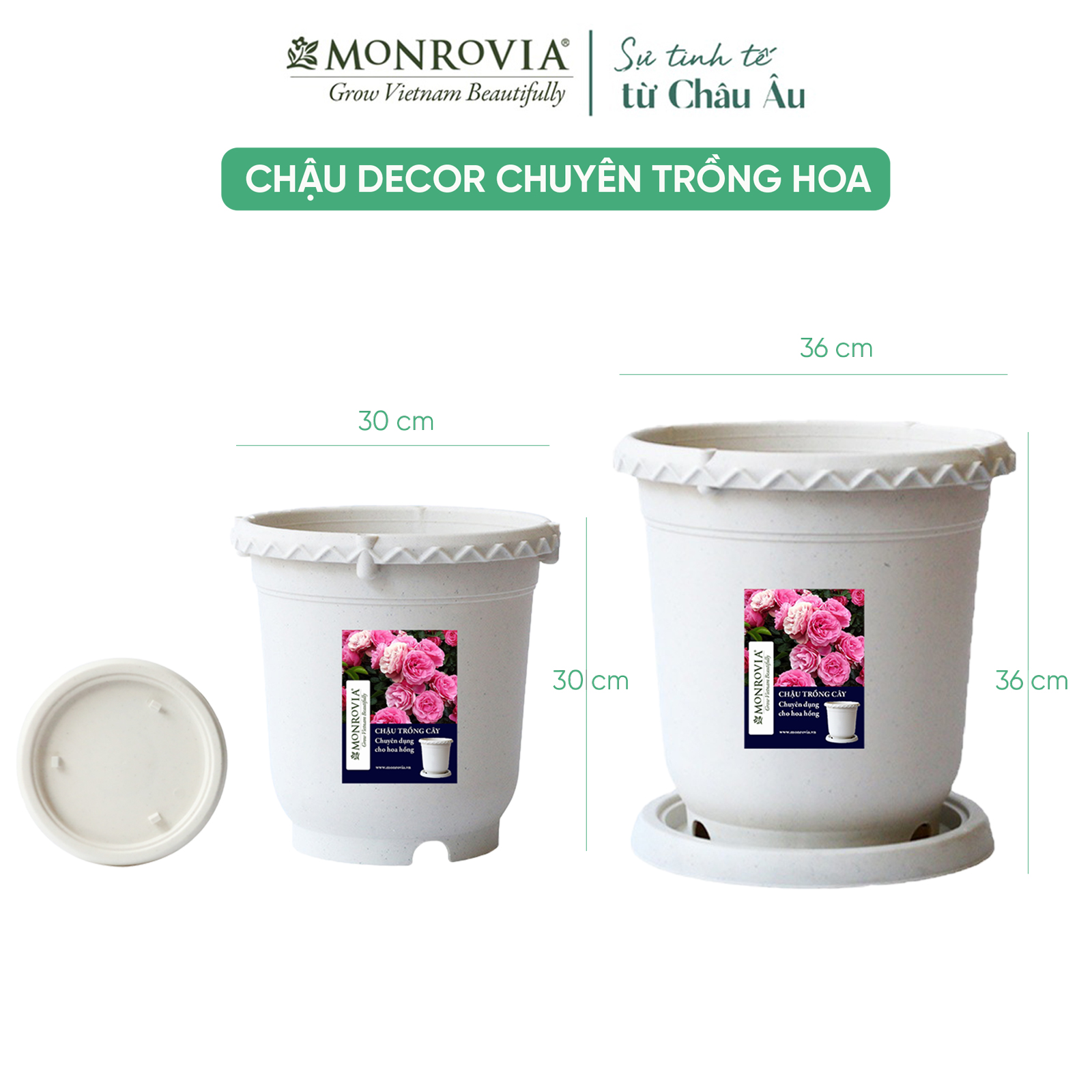 Với hai size chậu đường kích 30cm và 35cm sẽ phù hợp với từng giai đoạn phát triển của cây và các dòng cây khác nhau dễ dàng lựa chọn. Vì vậy, khi nhắc đến chậu trồng hoa hồng, Chậu trồng cây Monrovia chuyên cho hoa hồng sẽ là sự lựa chọn đầu tiên dành cho người dùng.