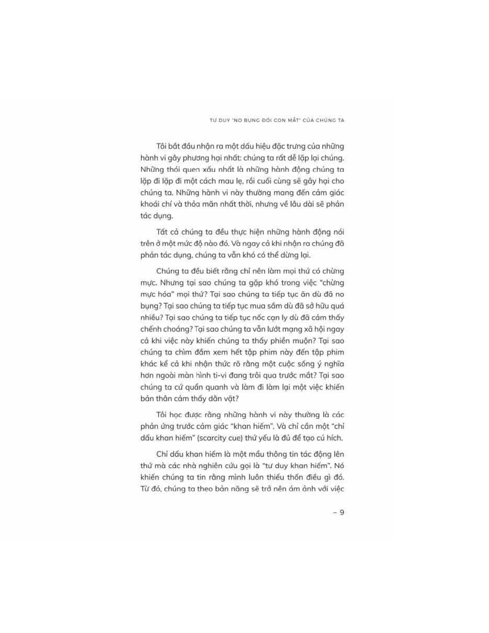 Cuốn sách đi sâu vào khoa học đằng sau những ham muốn này, rút ra từ khoa học thần kinh, tâm lý học và nhân chủng học. Cuốn sách cũng đưa ra những phương pháp đơn giản giúp chúng ta hướng tới lối sống “vừa đủ”,, củng cố những thói quen lành mạnh và sống trọn vẹn cũng như trân trọng những gì m.ình có, bao gồm: