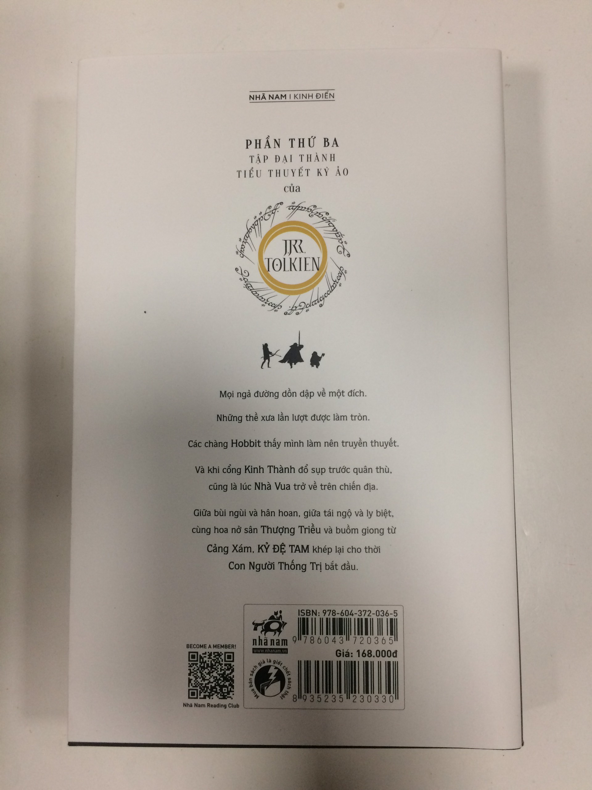 Phần Thứ Ba Tập đại thành Tiểu thuyết kỳ ảo của J.R.R. Tolkien Mọi ngả đường dồn dập về một đích. Những thề xưa lần lượt được làm tròn. Các chàng Hobbit thấy mình làm nên truyền thuyết. Và khi cổng Kinh Thành đổ sụp trước quân thù, cũng là lúc Nhà Vua trở về trên chiến địa. Giữa bùi ngùi và hân hoan, giữa tái ngộ và ly biệt, cùng hoa nở sân Thượng Triều và buồm giong từ Cảng Xám, Kỷ Đệ Tam khép lại cho thời Con Người Thống Trị bắt đầu.