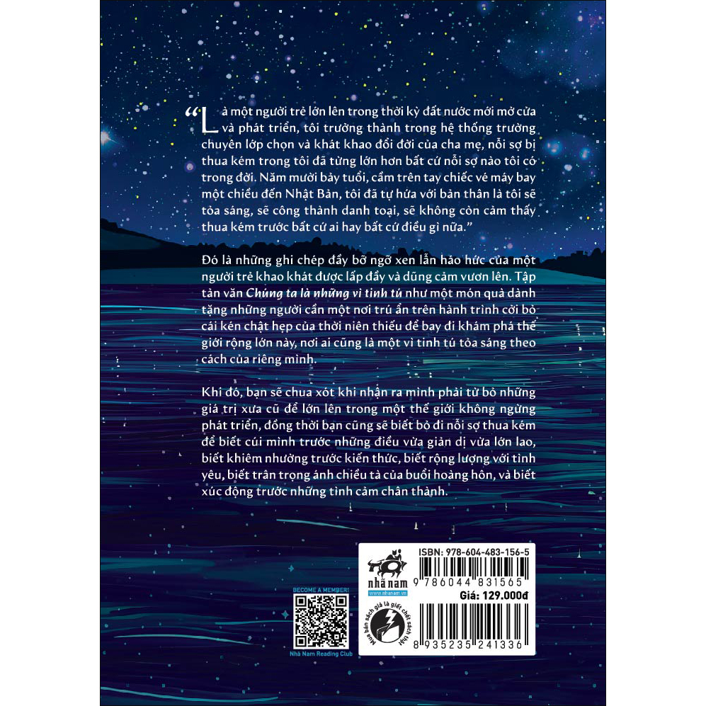 Đó là những ghi chép đầy bỡ ngỡ xen lẫn háo hức của một người trẻ khao khát được lấp đầy và dũng cảm vươn lên. Tập tản văn Chúng ta là những vì tinh tú như một món quà dành tặng những người cần một nơi trú ẩn trên hành trình cởi bỏ cái kén chật hẹp của thời niên thiếu để bay đi khám phá thế giới rộng lớn này, nơi ai cũng là một vì tinh tú tỏa sáng theo cách riêng của mình.