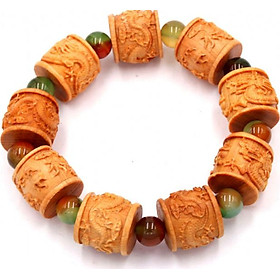 Kích thước : 9 hạt gỗ khắc hình trụ rồng 20mm x 20mm, đá thạch anh : 8 ly, vòng chuỗi dài 252mm