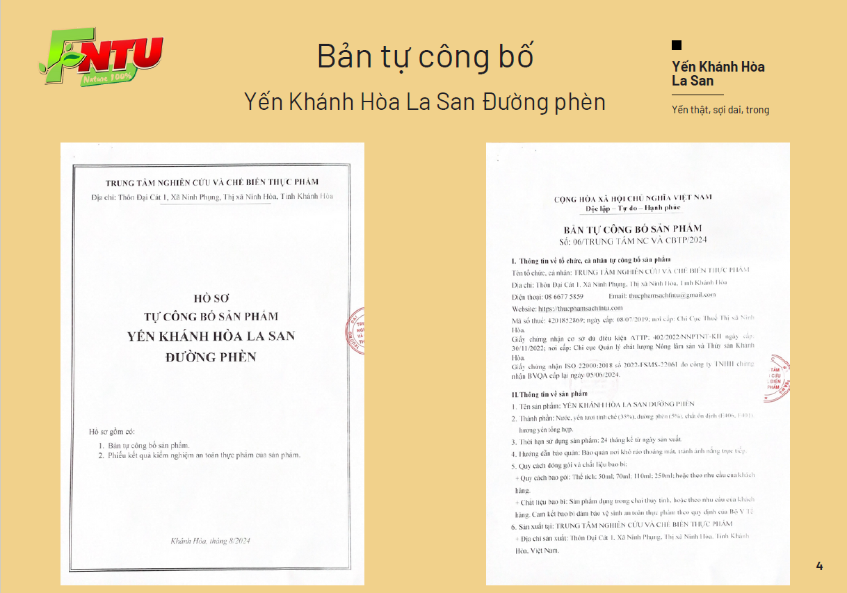 Yến Khánh Hòa La San Đường Phèn: được chế biến theo phương pháp truyền thống, kết hợp với công nghệ hiện đại trên dây chuyền thiết bị tiên tiến từ châu Âu. Điều này không chỉ giữ trọn vẹn hương vị tự nhiên mà còn bảo toàn tối đa các dưỡng chất quý giá có trong yến.