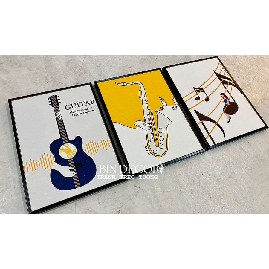 Tranh treo tường trang trí decor âm nhạc 12 - Kích thước của tranh : Kích thước : 25x35cmx3 tấm - 30x45cmx3 tấm - 40x60cmx3 tấm - 50x70cmx3 tấm - Khách hàng muốn thay đổi