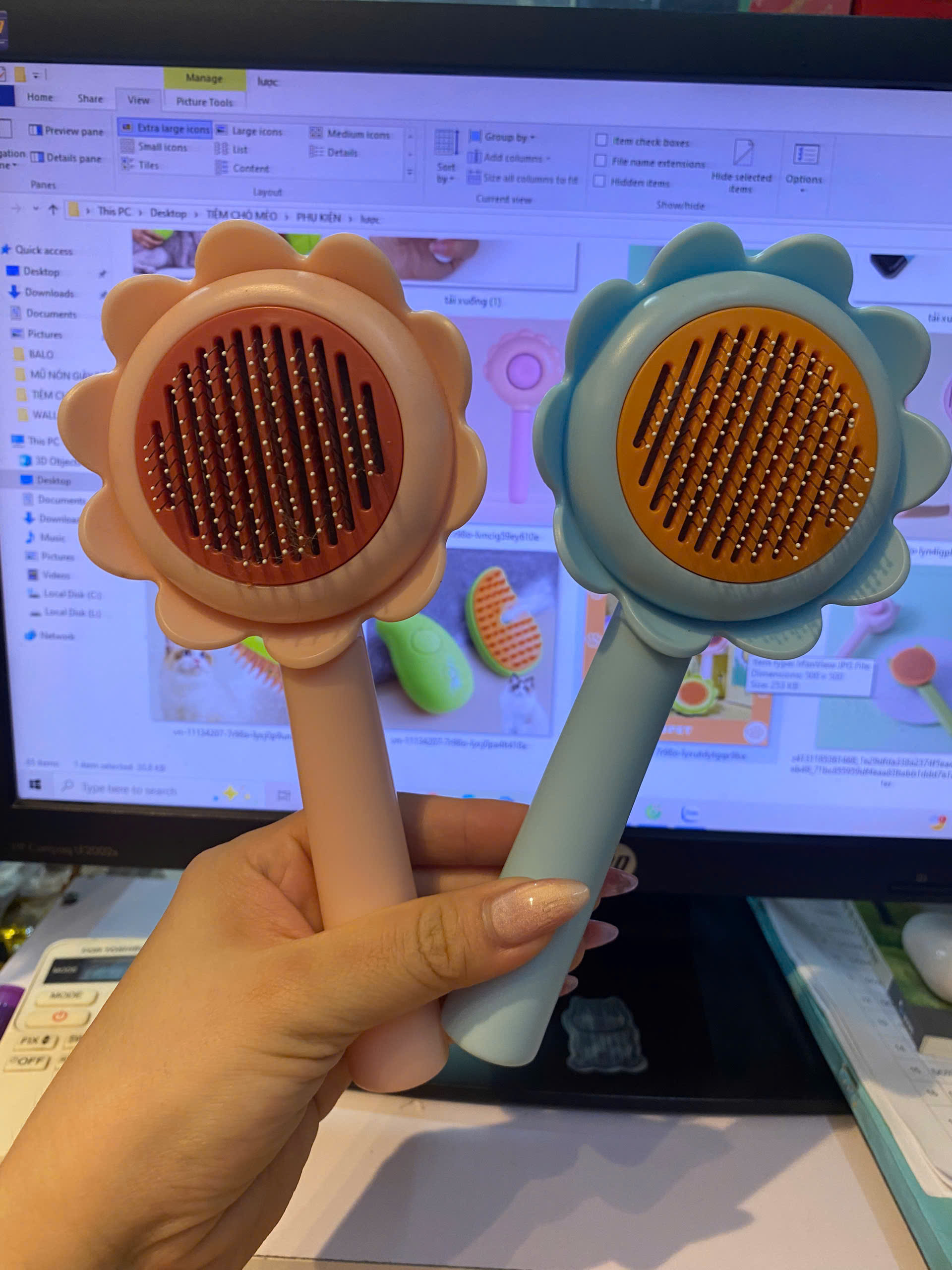 Lược chải lông rụng dành cho chó mèo có nút bấm hình hoa dễ thương Tay cầm thoải mái trên lược cho thú cưng này giúp cầm thoải mái. Nó có thiết kế có