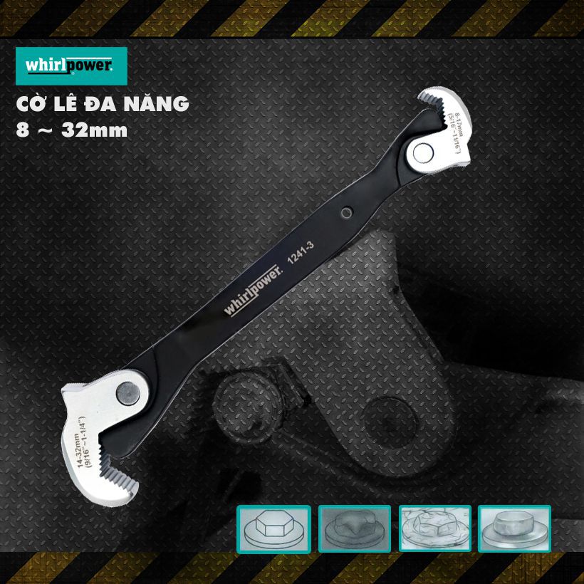 - Cờ lê đa năng 8 – 32mm Whirlpower 1241-3-0832 có thể sử dụng để vặn tất cả các bulong nhiều hình dạng khác nhau: hoa thị, răng cưa, lục giác, tứ giác, hình sao, kể cả những bulong gỉ sét, vỡ, nứt, hay mòn…