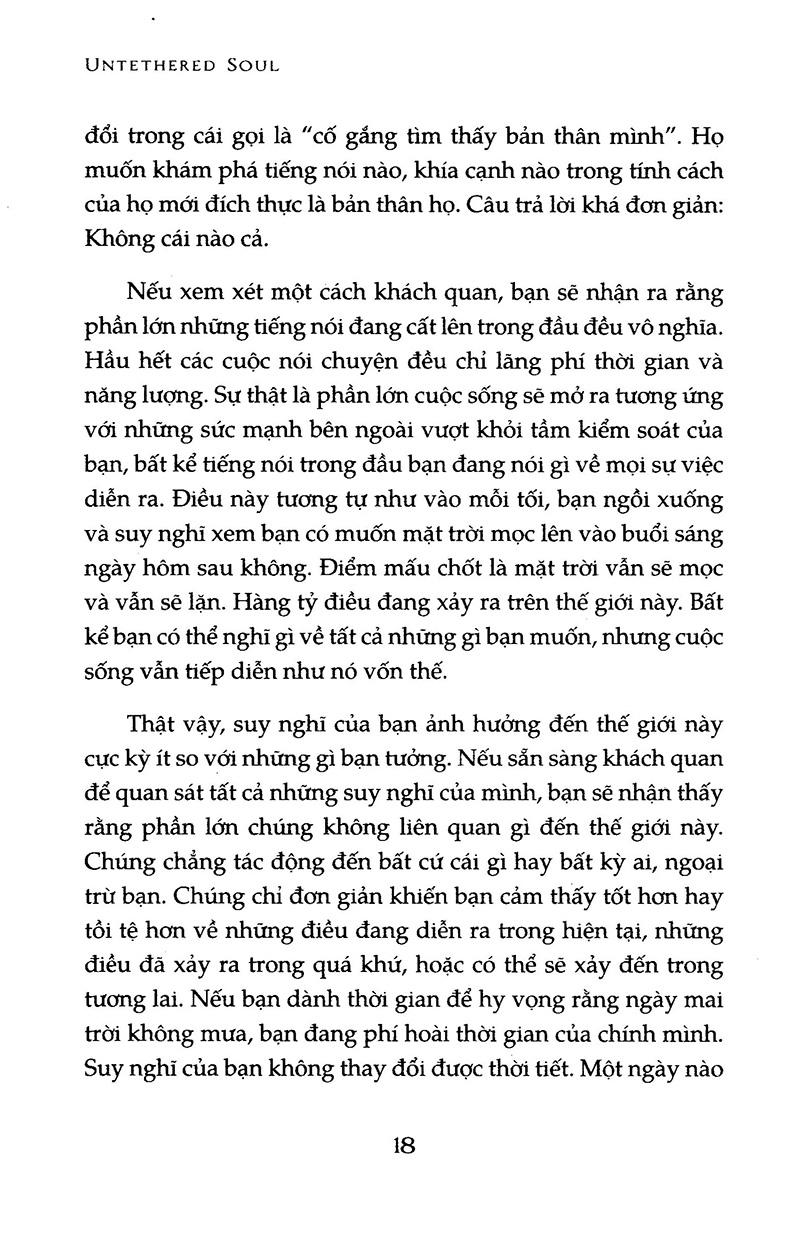 Không phải ngẫu nhiên mà Cởi trói linh hồn (The Untethered Soul) đã bán được hơn một triệu bản và trở thành Bestseller số 1 theo bình chọn của tờ báo danh tiếng New York Times. Những vấn đề của “cái tôi” mỗi người được bày biện ra, xếp đặt tỉ mỉ từ những điều giản dị đến vi tế nhất trong sách khiến người đọc vỡ òa với những phát hiện về chính mình. Bằng lối hành văn dẫn dắt lôi cuốn, nói về tâm linh nhưng dựa trên cơ sở khoa học, Cởi trói linh hồn khơi mở tất thảy những bí ẩn mà chúng ta đã vô tình hay chủ ý ẩn giấu. Đây chính là là lý do cuốn sách chạm được đến nhiều độc giả đến vậy.
