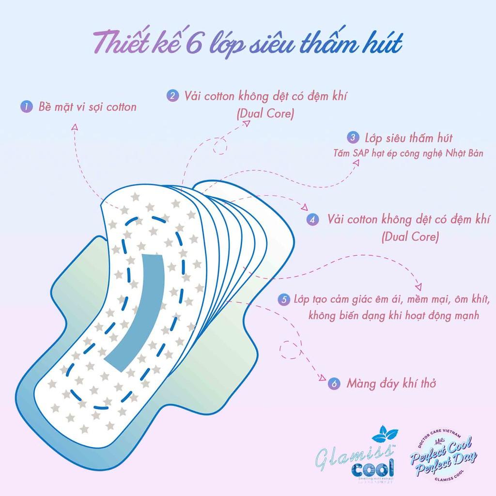 • Băng vệ sinh thảo dược Glamiss Cool ban ngày có cấu trúc 3D gồm 6 lớp thấm hút và kháng khuẩn nhưng vẫn giữ được kết cấu siêu mỏng, siêu nhẹ