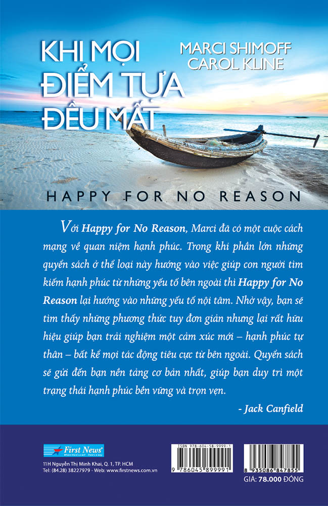 Với Happy for No Reason – Khi mọi điểm tựa đều mất, tác giả Marci Shimoff đã có một cuộc cách mạng về quan niệm hạnh phúc. Trong khi phần lớn những quyển sách ở thể loại này hướng vào việc giúp con người tìm kiếm hạnh phúc từ những yếu tố bên ngoài thì Happy for No Reason lại hướng vào những yếu tố nội tâm. Nhờ vậy, bạn sẽ tìm thấy những phương thức tuy đơn giản nhưng lại rất hữu hiệu giúp bạn trải nghiệm một cảm xúc mới – hạnh phúc tự thân – bất kể mọi tác động tiêu cực từ bên ngoài. Quyển sách sẽ gửi đến bạn nền tảng cơ bản nhất, giúp bạn duy trì một trạng thái hạnh phúc bền vững và trọn vẹn.