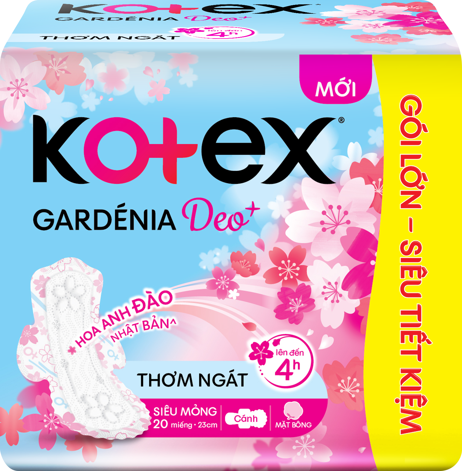 Trong suốt , các vấn đề như tràn băng và mùi hôi đã tạo ra sự bất tiện và tự ti cho hầu hết bạn gái. Nhằm giải quyết tình trạng này, Kotex đã phát triển dòng sản phẩm mới Kotex Gardenia Deo+ Hoa Anh Đào Nhật Bản, với tính năng đặc biệt là khả năng siêu khử mùi và thấm hút tối đa, giúp phái nữ tự tin và thoải mái hơn trong suốt thời gian kinh nguyệt.