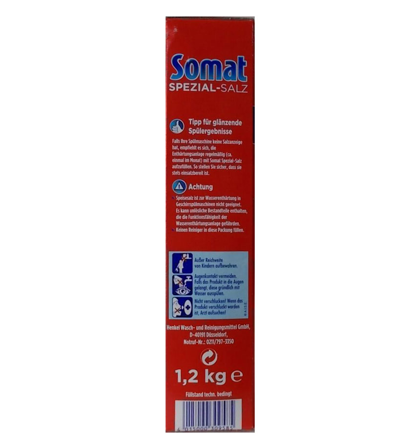 Muối rửa bát somat special salt chuyên dụng dành cho máy rửa bát. Khi sử dụng đổ 1luowngj vừa đủ vào bình đựng muối của máy và đổ thêm nước đầy vào bình chứa muối . Dùng thìa hoặc đũa có cán dài để quấy đều muối chứa trong bình như là quấy nước chanh với đường để muối có thể hòa tan với nước và làm tăng nồng độ của muối chứa trong bình đảm bảo cho chức năng của máy nhận biết và đo đếm được nồng độ muối báo hiệu cho bạn là muối đã đủ.