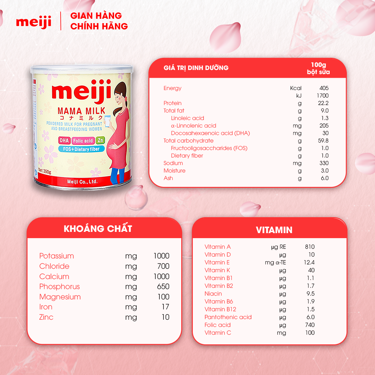 - Sản phẩm Meiji Mama Milk cung cấp nguồn dinh dưỡng đầy đủ, vững chắc cho phụ nữ đang mang thai và cho con bú với hương vị thơm ngon, dịu ngọt dễ uống, sản phẩm không chỉ cung cấp đầy đủ các chất dinh dưỡng cơ bản như chất đạm, chất béo, chất đường bột mà còn bổ sung các vitamin và khoáng chất đặc biệt cần thiết.