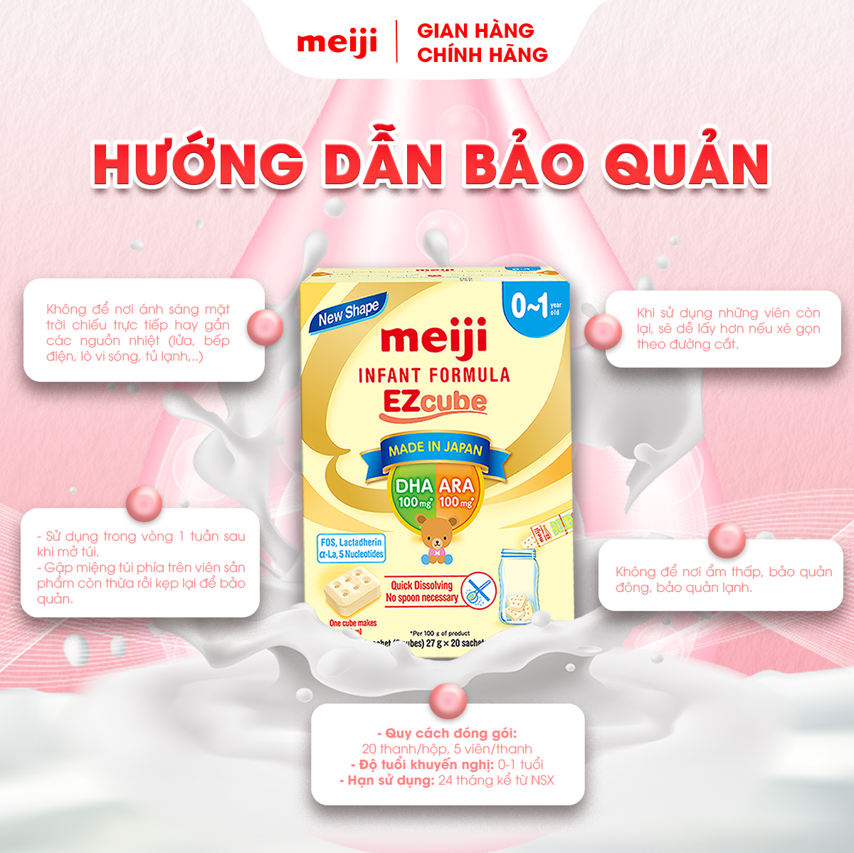 - Nếu không uống được hết trong 1 lần thì có thể chia ra 3-4 cốc 100ml để uống. MEIJI INFANT FORMULA EZCUBE: