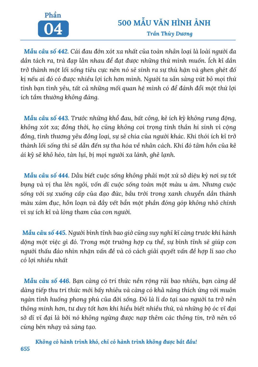 Trong bài văn Nghị luận xã hội, sự luận lập đóng vai trò quan trọng và quyết định điểm số của toàn bộ bài văn. Khi triển khai ý, không có sự lập luận, thì mọi lý lẽ đưa ra chỉ là lý thuyết. Nên qua 500 ý văn lập luận cô đã cung cấp trong sách, các bạn sẽ học thêm được những ý văn lập luận sắc sảo cho bài viết của mình.