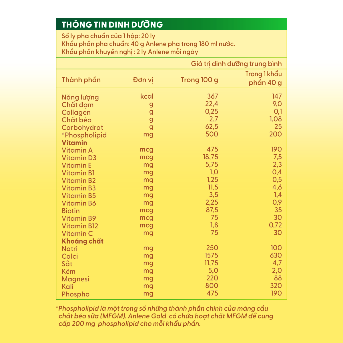 - Anlene Gold 5X/Anlene 5 khoẻ vàng mới là sản phẩm sữa chứa phức hợp dinh dưỡng với hoạt chất MFGM được kiểm nghiệm lâm sàng giúp cải thiện toàn diện hệ vận động: Cơ khỏe, Xương chắc, Khớp linh hoạt, Nhanh nhẹn hơn, Thêm năng lượng. Thành phần Đặc điểm nổi bật Tăng cường sức khỏe xương khớp: Với phức hợp dinh dưỡng và hoạt chất MFGM đã được kiểm nghiệm lâm sàng, giúp tăng 40% khối lượng cơ, hỗ trợ xương khớp chắc khỏe, dẻo dai. Cung cấp đầy đủ dưỡng chất: Đạm, canxi, vitamin nhóm B, vitamin C và collagen giúp cơ thể khỏe mạnh, tăng cường sức đề kháng. Hương vị thơm ngon: Hương vani tự nhiên, dễ uống, không gây ngấy. Tiện lợi: Dạng bột, dễ pha chế, có thể sử dụng bất cứ khi nào. Công dụng Mỗi ngày sử dụng 2 ly sữa kết hợp cùng vận động đều đặn trong 4 tháng sẽ giúp: