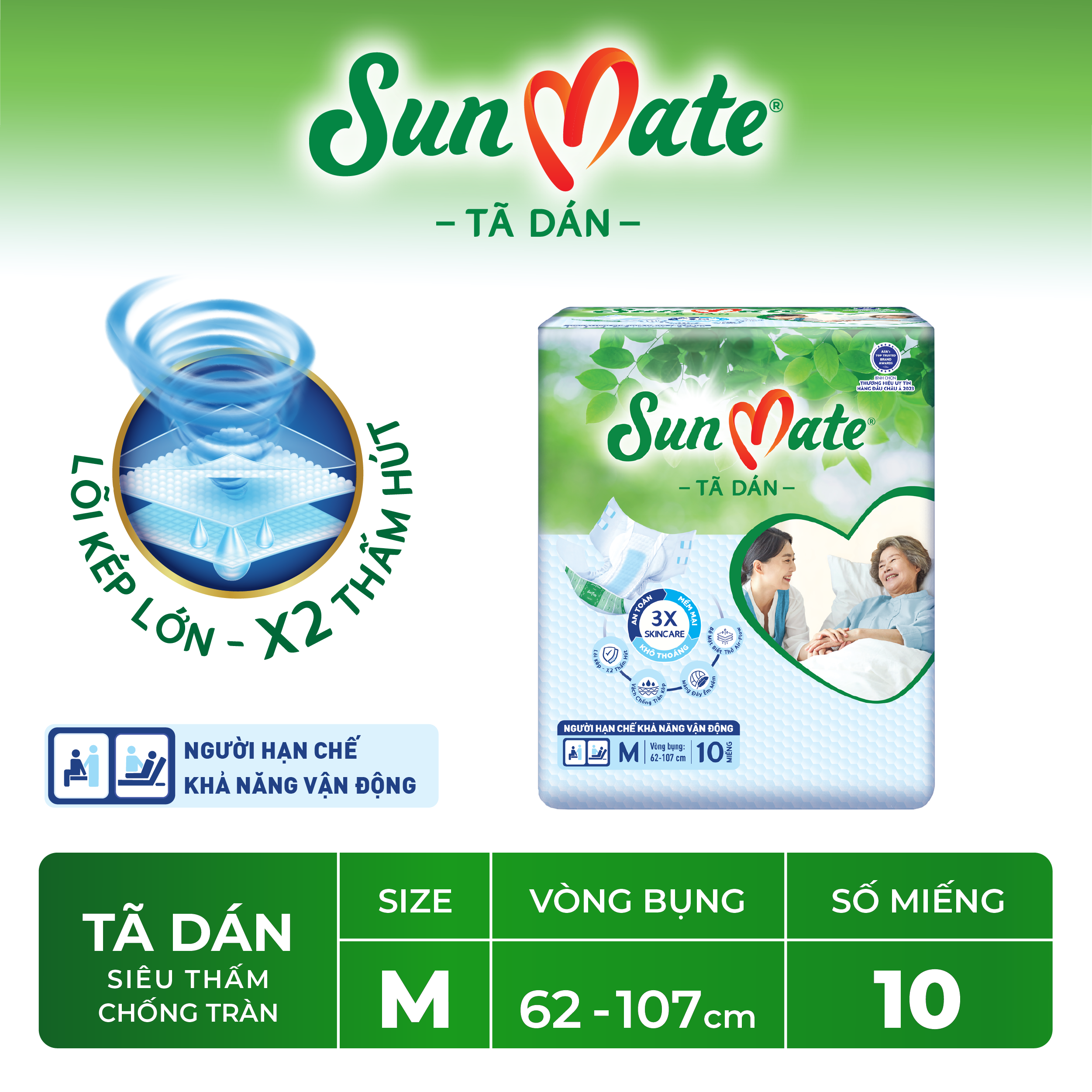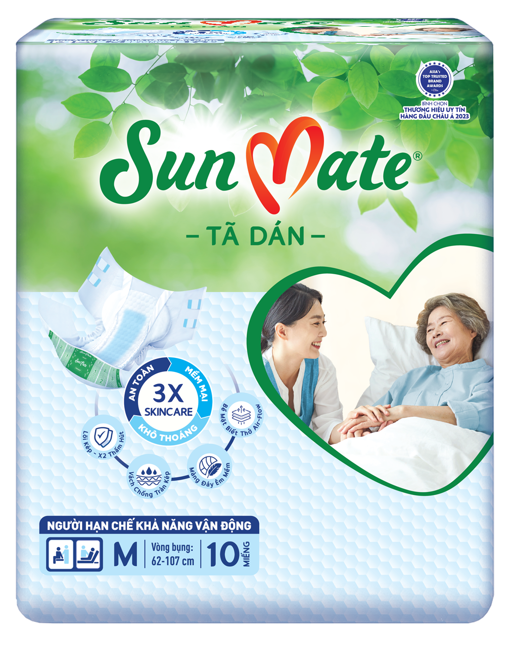 - Với công nghệ tiên tiến nhất tạo ra các sản phẩm mềm mại, thoáng khí, khả năng kháng khuẩn, nhằm giảm thiểu sự phát triển mùi và thấm hút cực nhanh, SunMate là lựa chọn tối ưu cho việc chăm sóc vệ sinh người cao tuổi, giúp họ luôn thoải mái, an toàn tự tin vui sống mỗi ngày. SunMate là người bạn đồng hành giúp chăm sóc người thân yêu tốt nhất.