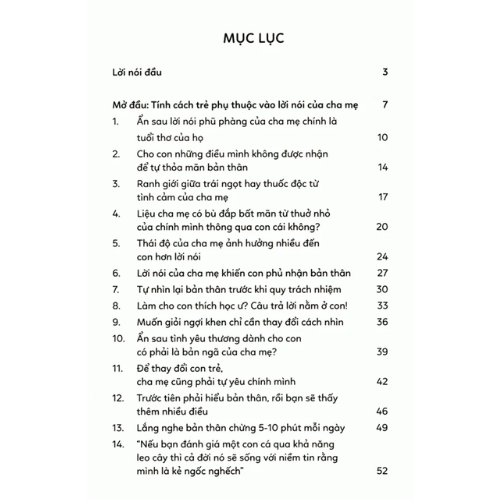 • Cuốn sách chia sẻ những câu nói "có phép lạ" giúp cha mẹ giao tiếp hiệu quả với con cái. Thay vì la mắng, trách mắng, cuốn sách hướng dẫn cha mẹ sử dụng những câu nói khẳng định, khuyến khích để giúp trẻ tự tin, tự giác và phát triển toàn diện. Bên cạnh đó, cuốn sách cũng cung cấp những lời khuyên hữu ích giúp cha mẹ hiểu rõ hơn về tâm lý của trẻ và xây dựng mối quan hệ tốt đẹp với con.