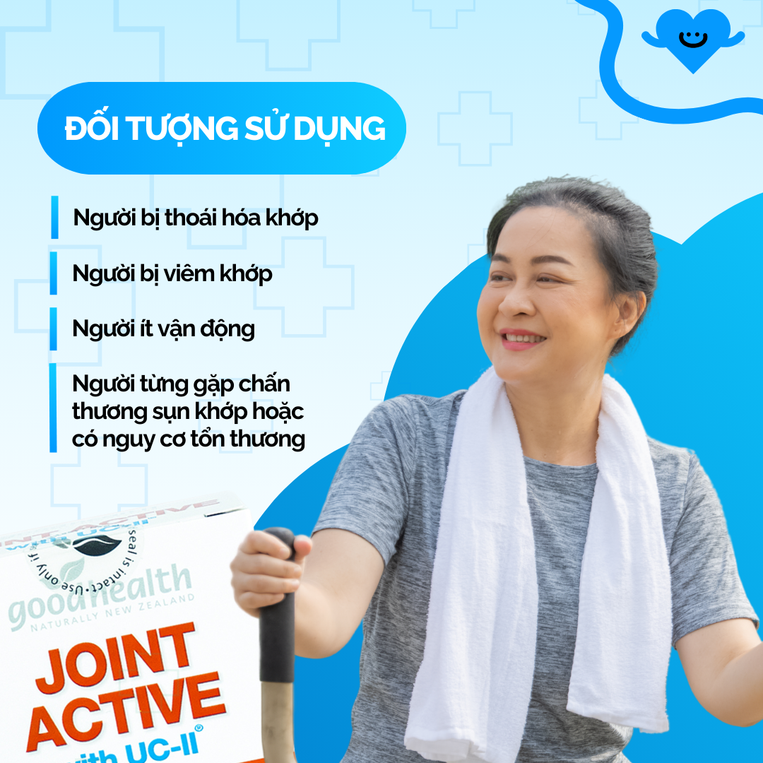GIỚI THIỆU SẢN PHẨM GOODHEALTH JOINT ACTIVE    Viên sụn khớp Goodhealth Joint Active: Hộp 30 viên nang   Sản phẩm Joint Active được nhập khẩu chính hãng từ Good Health New Zealand - thương hiệu nổi tiếng về các sản phẩm bảo vệ sức khỏe có nguồn gốc từ tự nhiên. UC-II được chiết xuất hoàn toàn từ sụn ức gà nên đảm bảo lành tính, an toàn cho người sử dụng. Dựa theo các nghiên cứu lâm sàng cho đến nay chưa ghi nhận tác dụng phụ nào từ UC-II cho những người gặp vấn đề về xương sụn khớp.    ƯU ĐIỂM NỔI BẬT  Bổ sung hoạt chất thế hệ mới UC-II (Collagen type 2 không biến tính)  UC-II (collagen type 2 không biến tính) trong thành phần của Viên sụn khớp Joint Active là hoạt chất thế hệ mới đã được nghiên cứu và kiểm định lâm sàng bởi Đại học Y khoa Harvard mang lại hiệu quả rõ rệt trong việc nuôi dưỡng và phục hồi sụn khớp bị tổn thương, tăng tiết dịch khớp trong trường hợp khô khớp, giúp giảm viêm, giảm đau và ngăn ngừa thoái hóa khớp.    Viên sụn khớp Joint Active hiện đang nhận được nhiều phản hồi tích cực từ những người gặp vấn đề về sụn khớp như dân văn phòng, người chơi thể thao và đặc biệt là người cao tuổi.   Cơ chế 3 tác động  Thành phần trong viên sụn khớp Joint Active được kết hợp với mục đích các chất bổ trợ nhau, giúp tăng cường hiệu quả của các chất còn lại.    Thông qua đường uống, Collagen tuýp II không biến tính bổ sung Collagen tại các sụn khớp, giúp giảm đau, tái tạo và nuôi dưỡng sụn khớp. Một phần UC-II được hấp thu còn giúp điều chỉnh đáp ứng miễn dịch, bảo vệ sụn khớp, hỗ trợ làm chậm quá trình thoái hóa khớp.    Bên cạnh đó, Vitamin D trong Joint Active giúp hấp thụ canxi và phospho phòng tránh loãng xương, bảo vệ xương dưới sụn giúp ngăn ngừa thoái hóa sụn.    Đặc biệt, Joint Active còn được bổ sung thêm Boron – vi chất dinh dưỡng giúp hấp thụ vitamin D, làm tăng mật độ xương giúp xương chắc khỏe, chống viêm, giảm viêm khớp, ngăn ngừa loãng xương.    Tác dụng và hiệu quả nhanh hơn  Hợp chất UC-II được đã được nghiên cứu, kiểm định lâm sàng bởi Đại học Y khoa Harvard an toàn và hiệu quả gấp 2,3 lần so với Glucosamine và Chondroitin.    Trên Tạp chí International Journal of Medical Science, nghiên cứu được đăng tải của tác giả David C. Crowley cũng cho thấy Collagen tuýp II không biến tính giúp hỗ trợ giảm tình trạng cứng khớp và khó vận động là 33%, hỗ trợ giảm tình trạng đau nói chung đến 44%, chỉ trong 90 ngày.   Không tác dụng phụ Các hoạt chất đều nghiên cứu ở hàm lượng an toàn, không gây ảnh hưởng tới tiêu hóa hay bất kì tác dụng phụ nào, hoàn toàn có thể sử dụng lâu dài.  THÀNH PHẦN CỦA VIÊN SỤN KHỚP JOINT ACTIVE    Trong mỗi viên Goodhealth Joint Active có chứa: Thành phần (cho 1 viên)  Sụn tiêu chuẩn hóa UC-II 40mg  Vitamin D 200IU Boron 2mg  CÔNG DỤNG SẢN PHẨM Tái tạo và duy trì sụn khớp  Hoạt chất UC-II với tác dụng kích thích tế bào sụn tăng sinh tổng hợp proteoglycan, cung cấp dinh dưỡng cho sụn khớp, kích thích cơ thể sản xuất các sợi collagen, bảo vệ sự đàn hồi của khớp giúp tái tạo sụn khớp, ức chế một số enzym phá hủy sụn khớp và các enzym kích hoạt phản ứng viêm.    Ngăn ngừa và hỗ trợ điều trị viêm khớp dạng thấp  Goodhealth Joint Active với UC-II là sản phẩm sử dụng được cho những người bị thoái hóa sụn khớp xương, những người mắc các bệnh sụn khớp cấp tính mãn tính, viêm khớp dạng thấp, thoái hóa khớp, thấp khớp.    Hạn chế thoái hóa khớp  Cơ chế 3 tác động từ UC-II, Vitamin D và Boron có tác dụng cung cấp dinh dưỡng cho sụn khớp, hút nước và các phân tử proteoglycan, kích thích tế bào sụn sản xuất proteoglycan. Tăng độ bền vững và dẻo dai của các sợi collagen, tăng sự đàn hồi của mô liên kết, ức chế các men tiêu protein, ngăn chặn quá trình thoái hóa sụn khớp.   Duy trì sức khỏe của xương  Bản chất của xương là mô sống và phát triển liên tục. Hai vật liệu cần thiết để tạo nên xương là collagen và canxi. Trong đó, collagen là một loại protein cung cấp khung mềm, canxi là một khoáng chất giúp tăng cường độ mạnh và cứng của xương. Sự kết hợp này giúp xương chắc khỏe và linh hoạt đủ để chống chọi với tác động từ bên ngoài.    Sự kết hợp của UC-II, Vitamin D và Boron trong thành phần viên sụn khớp Joint Active giúp bổ sung các dưỡng chất cho xương, từ đó giúp duy trì sức khỏe xương khớp ổn định.    Phòng tránh loãng xương  Khi đã qua 30 tuổi, quá trình mất xương có thể bắt đầu diễn ra nhanh hơn so với sự phát triển của xương mới. Qua thời gian, bạn có thể bị loãng xương lúc về già. Những người bị loãng xương thường bị gãy xương hông, cột sống và cổ tay.    Nếu bạn muốn có một hệ xương sụn khớp chắc khỏe và duy trì mật độ xương ở mức cao nhất thì Joint Active sẽ giúp cung cấp Collagen type 2 không bi