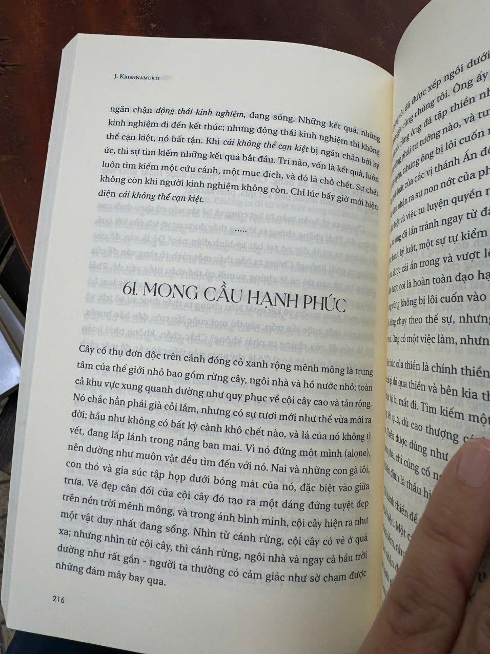 Với con mắt quan sát đầy tinh tế, Krishnamuti đã miêu tả thiên nhiên, con người trong đời sống thật tự nhiên – như chính những gì đang diễn ra. Từ đầu đến cuối cuốn sách, tại bất cứ một trang sách nào, chúng ta cũng đều bắt gặp những vấn đề của đời sống thường ngày - không hề xa lạ.
