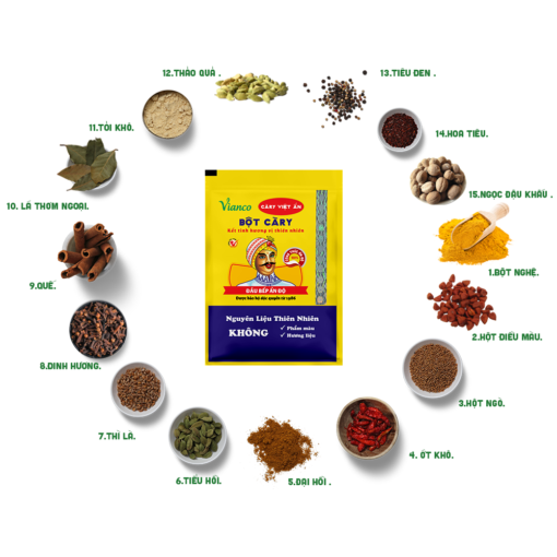 - Thành Phần: Nghệ, hột điều màu, hột ngò, ớt khô, đại hồi, tiểu hồi, đinh hương, quế, thảo quả. KHÔNG CHỨA BỘT MÀU TỔNG HỢP.
