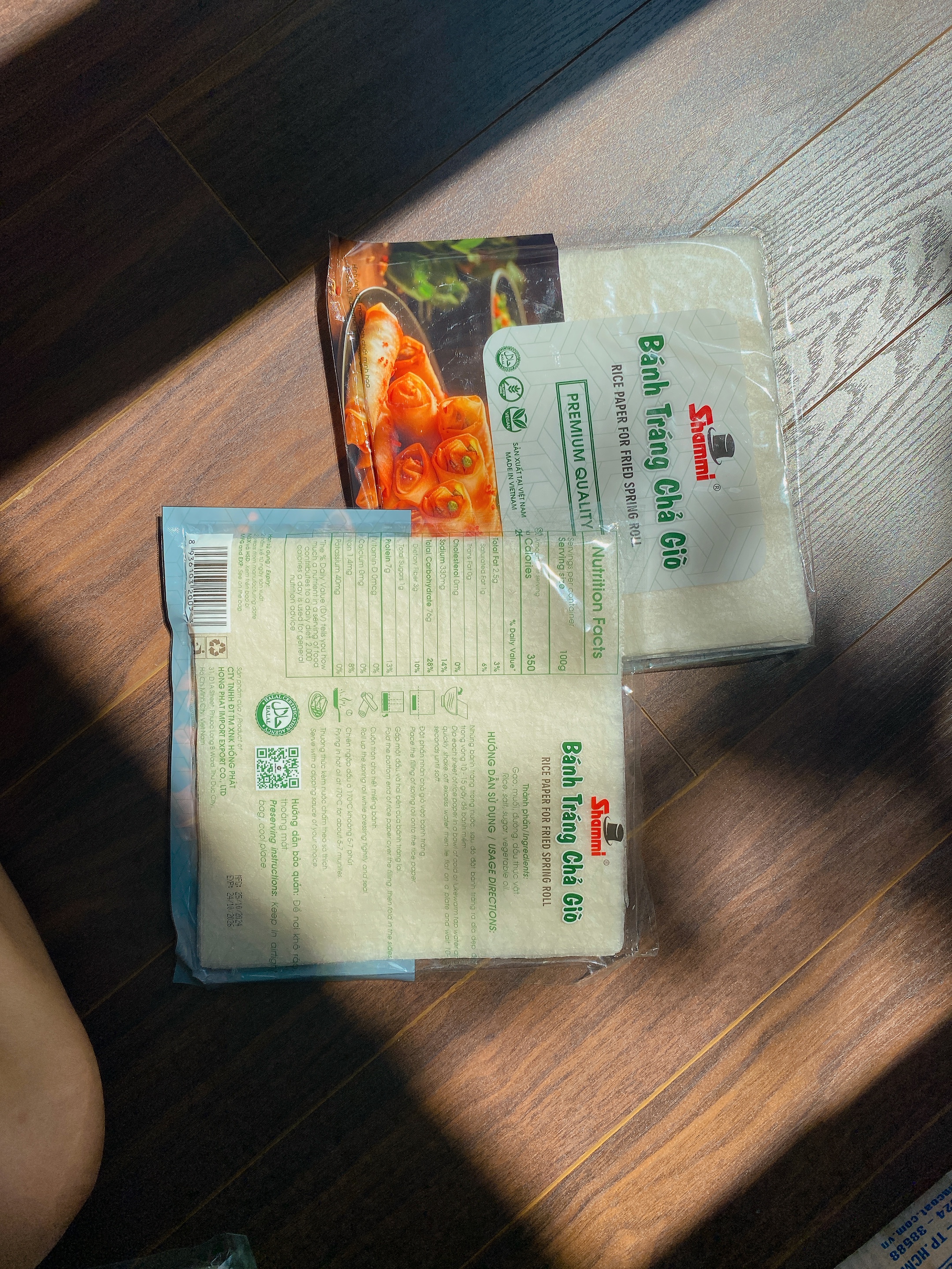 Bánh tráng chả giò Shammi: Gạo, Nước, Muối, Dầu thực vật.
