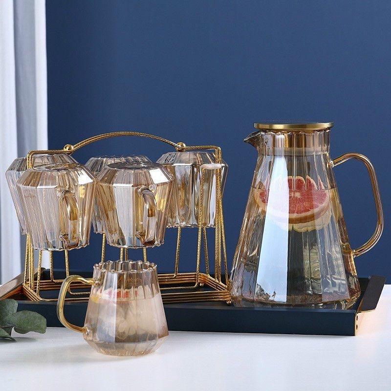 ✨Combo bình đựng nước uống thủy tinh vàng vân sọc kèm khay và giá úp cốc ( giá úp cốc kim lọai mạ vàng giao ngẫu nhiên )